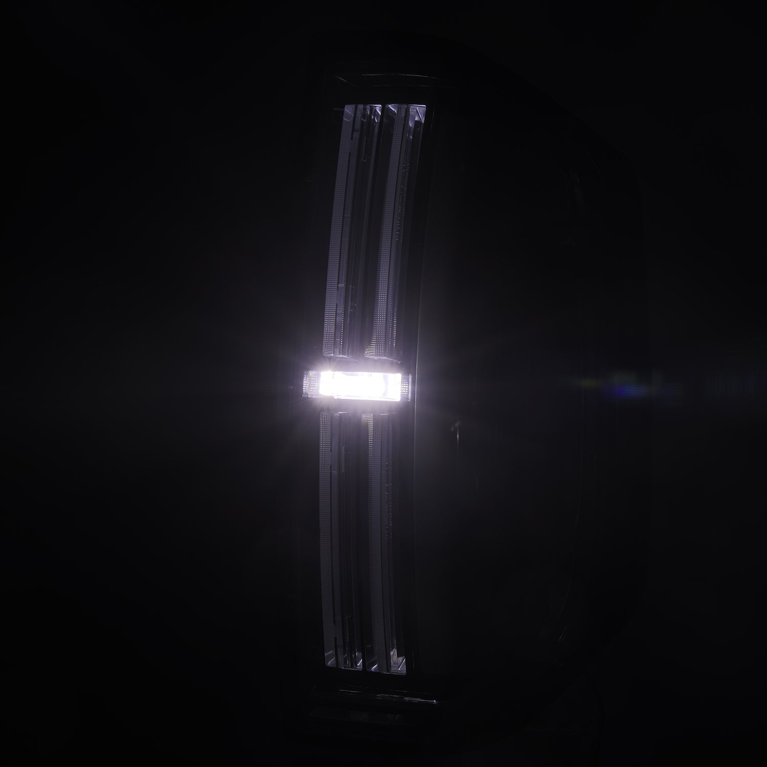 The trapezoidal prisms illuminate with red LEDs for parking lights, intensifying when braking. For turn signals, amber LEDs activate across the prisms and the LED side panel in a dynamic sequential flow, adding a modern touch. The side LED tube mirrors the signature look of the 3rd Gen Tundra, providing additional parking light functionality, while the central LED tube lights up with white LEDs as a reverse indicator.