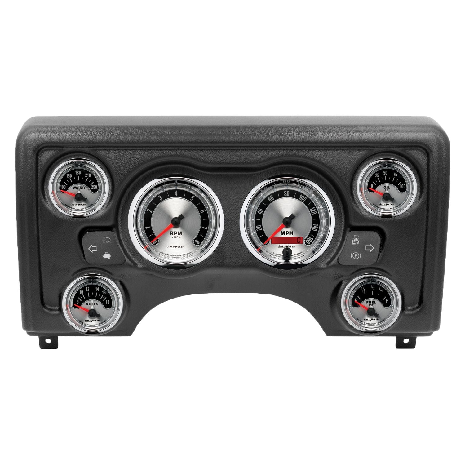 - Includes 3-3/8" American Muscle electric speedometer & tachometer and 2-1/16" electric, water temperature, oil pressure, fuel level, and voltmeter