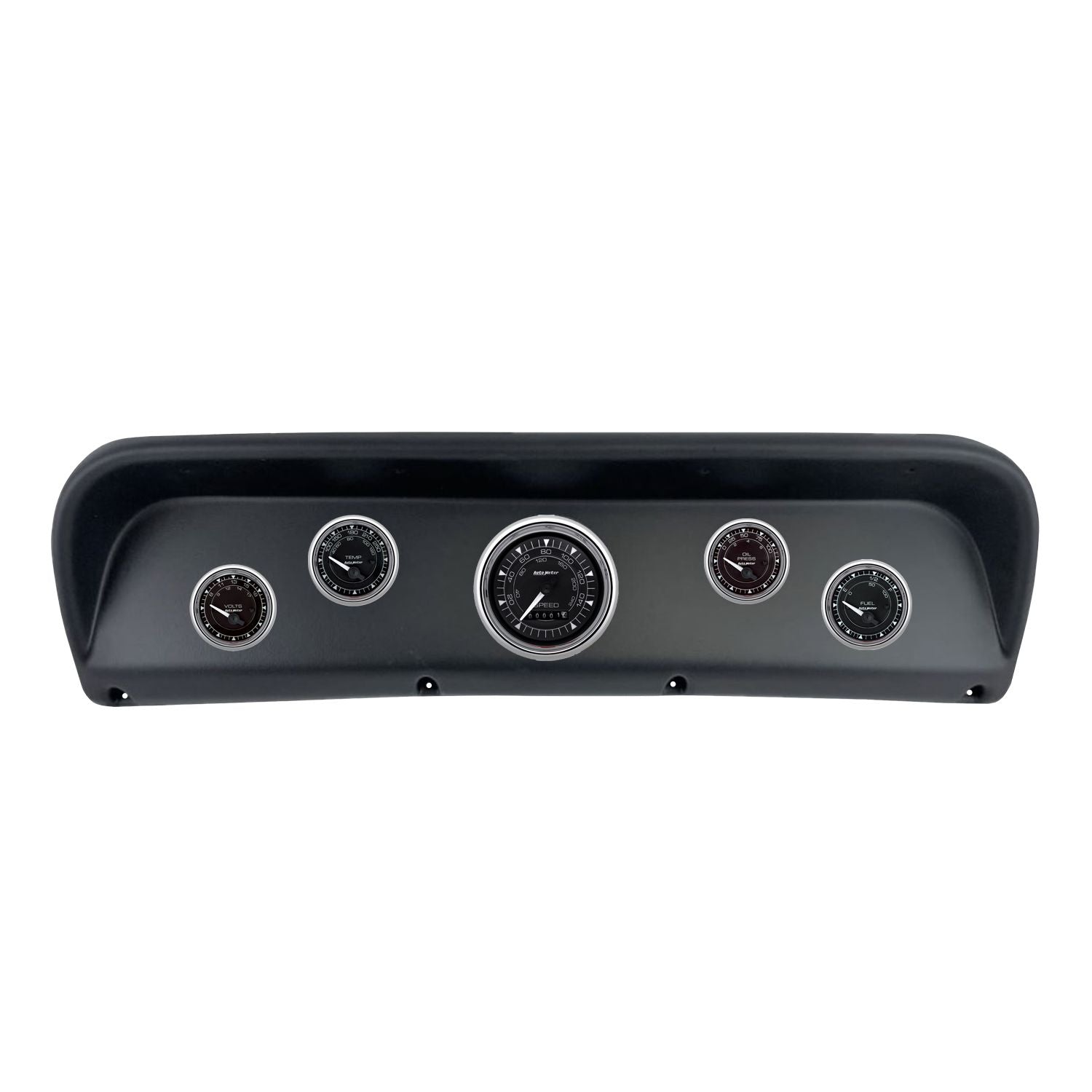 - Includes 3-3/8" Chrono Chrome electric speedometer & tachometer and 2-1/16" electric, water temperature, oil pressure, fuel level, and voltmeter