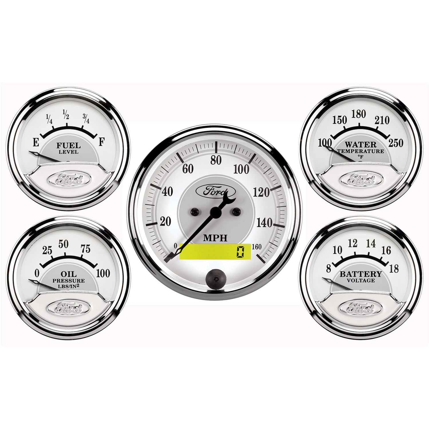 AutoMeter has brought together the most popular gauges into a simple kit. The kit includes a speedometer, water temperature, oil pressure, fuel level, and voltmeter. All senders included where applicable. Officially licensed Ford product.