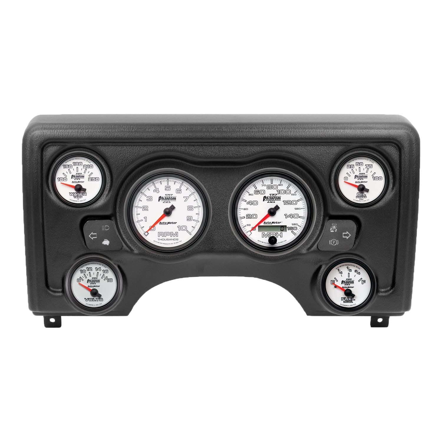 - Includes 3-3/8" Phantom II electric speedometer & tachometer and 2-1/16" electric, water temperature, oil pressure, fuel level, and voltmeter