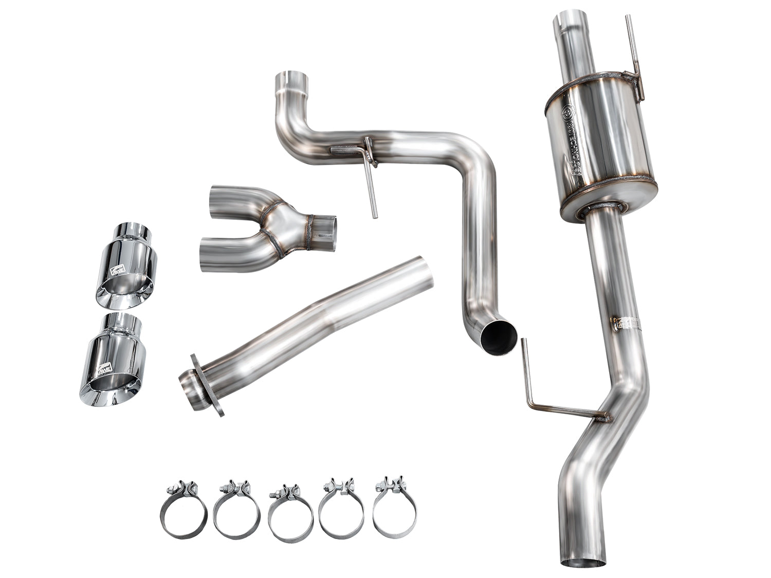 Featuring a non-resonated mid-pipe and AWE’s proprietary, patented drone-canceling solution, 180 Technology®, the 0FG Exhaust delivers a unique dose of refined aggression out of your F-150, without any drone at cruising speeds.The AWE 0FG Exhaust is a rugged 3" T304L stainless steel catback configuration with a 100% straight-through design for optimal flow and power output. Regardless of low or high gear, the 0FG Exhaust will be on the top of your playlist. Bringing up the rear are dual 4.5" double-walled, slash-cut tips in chrome silver.