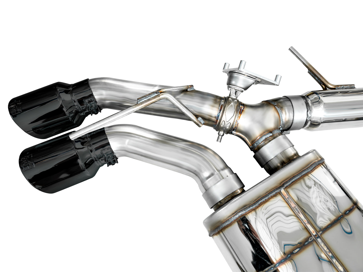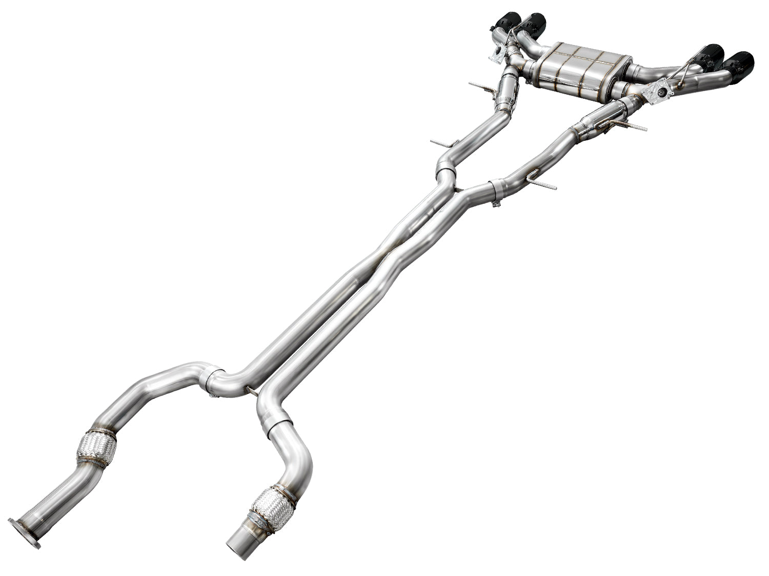 A dual 3" catback configuration constructed of US-sourced T304L stainless steel featuring a bespoke AWE X-pipe to harness the V6TT, patented drone-canceling 180 Technology®, full factory valve functionality, and rigidity where it matters most, all topped with quad double-walled, slash-cut tips in diamond black. This is the do-it-all exhaust for the Cadillace CT4-V Blackwing.