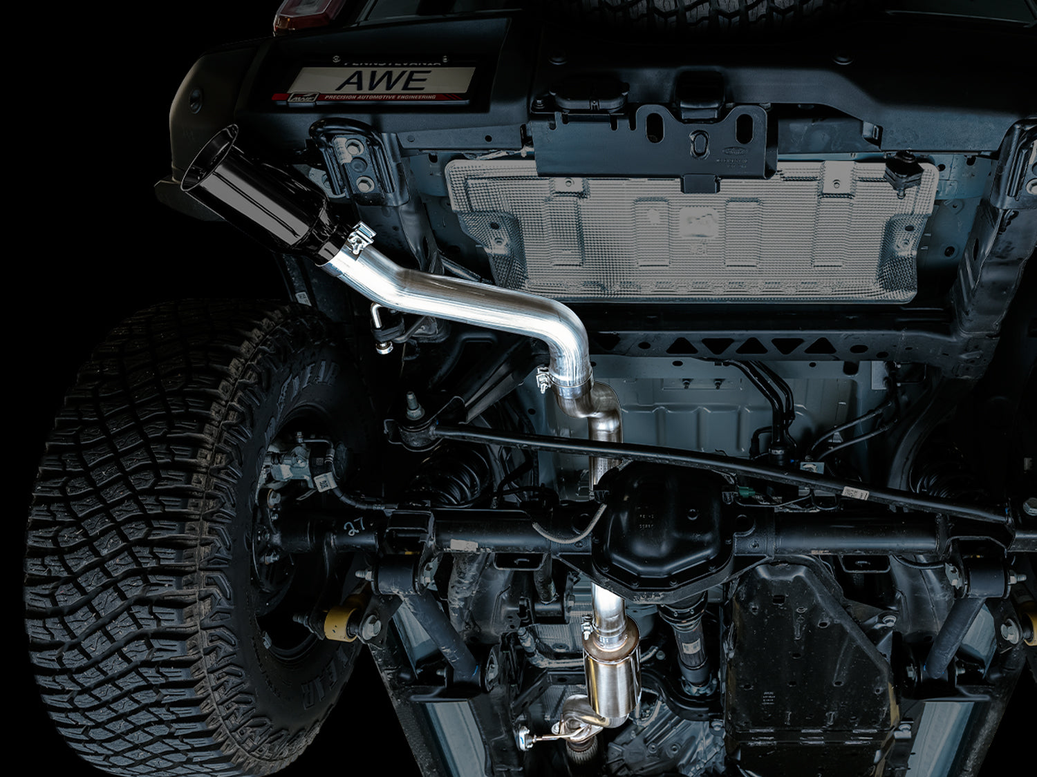 Handcrafted from US-made 3" T304L stainless steel, the 0FG Exhaust is a straight-through Cat Back configuration applicable to all Bronco models – 2.3T, 2.7TT, 2-door and 4-door – with modular capabilities unlike anything on the planet. The 0FG Exhaust features a bespoke AWE resonator in the mid pipe to produce an appropriate dose of aggression, followed by smooth bends towards the rear of the Bronco. On the way to the rear, depending on how many doors there are on your Bronco, lies an included adapter to bridge the difference in length across models. 2-door owner simply won't need these adapters, but 4-door owners will be thrilled. The 0FG modularity shines at the final breakpoint in the exhaust route. Not only does the 0FG accommodate various tip options, it also accommodates AWE’s BashGuard™. What’s BashGuard? Thanks for asking. The AWE BashGuard™ is included in every 0FG exhaust, and enables the 0FG to be the one exhaust to rule them all. Thanks to the modularity in the rear, simply remove the rear axle-back portion of the 0FG and replace it with the high-tuck BashGuard™. BashGuard™ is appropriately equipped with a .125" thick reinforced stainless ring. Perfect for bashin’. This version of the AWE Bronco Exhaust is the Single Side Exit: one big ‘n’ proud 5" double-walled tip in diamond black, straight-cut tip exiting behind the left rear tire, adding a dose of aggression to the Bronco you never knew it needed. One exhaust. Every terrain. AWE's No CEL Guarantee, Perfect Fitment Guarantee, and Lifetime Warranty come standard.