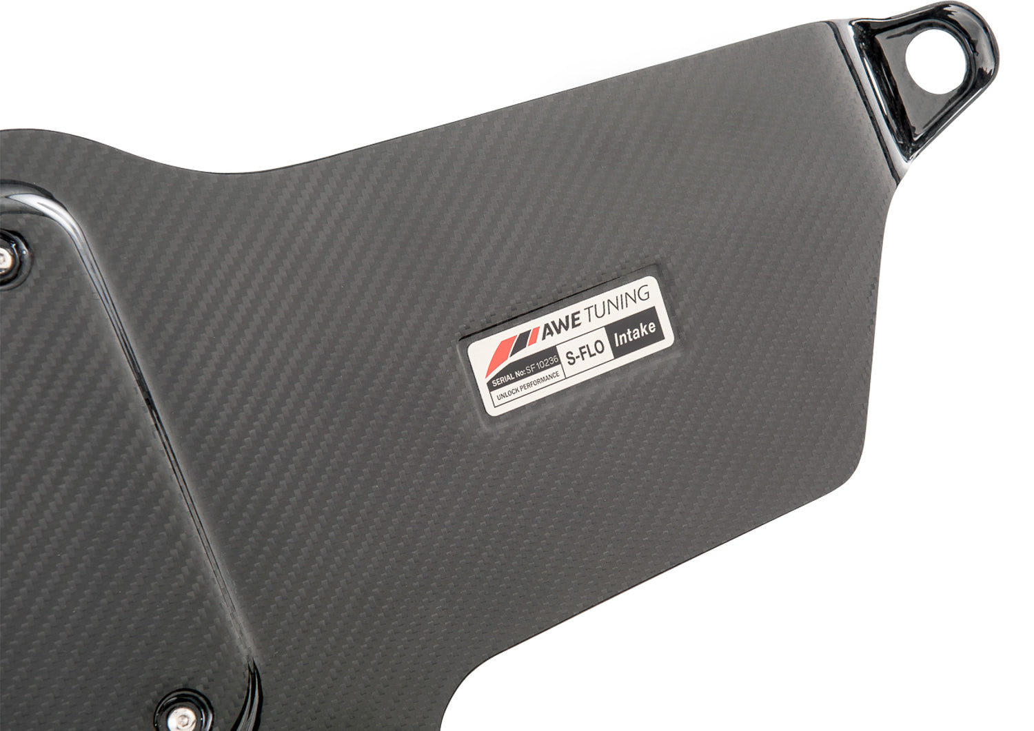 The AWE S-FLO Carbon Intake is a fully enclosed carbon fiber air box made from high-grade UV stabilized 2x2 twill carbon fiber to reduce yellowing from underhood heat. This air box mounts securely in the stock location and mates up to the factory air inlet pipes, perfectly. It boasts simple access for filter inspection and helps to deliver as much power as it does good looks. The included AWE S-FLO Filter is specifically designed to maximize airflow in the AWE S-FLO Carbon Intake. This increased flow unlocks impressive max gains of 16hp and 17ft-lbs of torque at the crank. The carbon fiber airbox and S-FLO Filter combination make for an easily serviceable air filter without removing the airbox. The combo produces a more aggressive intake note than stock, with a distinctive turbo spool sound, all while keeping your car operating Check Engine Light free. Please note, AWE S-FLO Intakes are for racing use only.