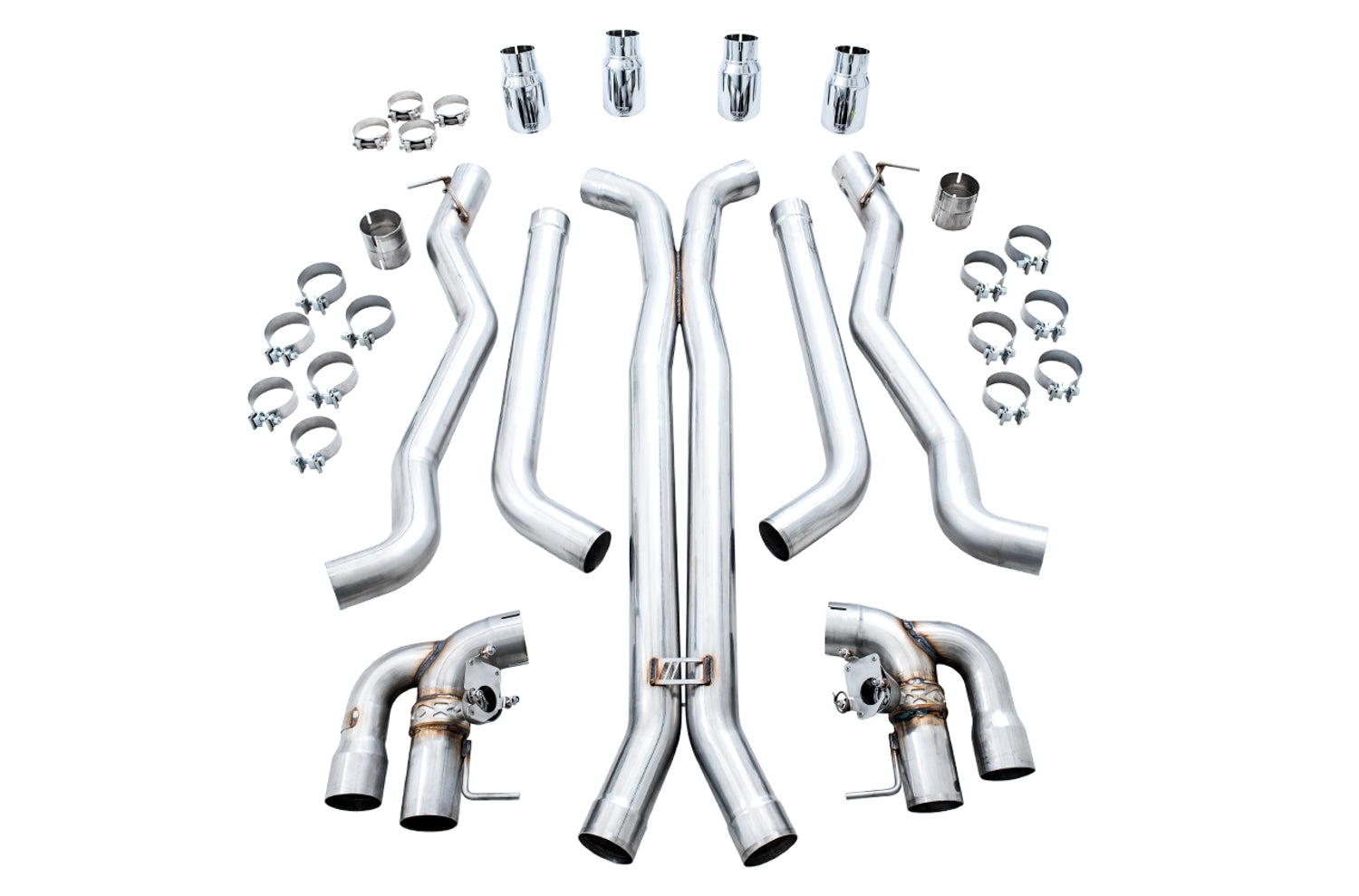 The SwitchPath™ Cat Back Exhaust features dual 3" CNC mandrel-bent .065" wall T304L stainless steel tubing from downpipes to tip outlets with a precision-engineered X-pipe in between. Equipped with valved rear sections, the SwitchPath™ Cat Back retains all of the M5’s valve behavior when changing driving modes and/or using the exhaust button found on the console. The AWE Performance Mid Pipes replace the factory mid section with a 3" stainless steel X-pipe, and are included in the Cat Back SwitchPath™ configuration. All tip options are 4", slash-cut, and include the AWE logo and double-walling to ensure a mirror finish even under hard usage. All tips are individually adjustable, allowing depth into the bumper to be set according to personal taste.