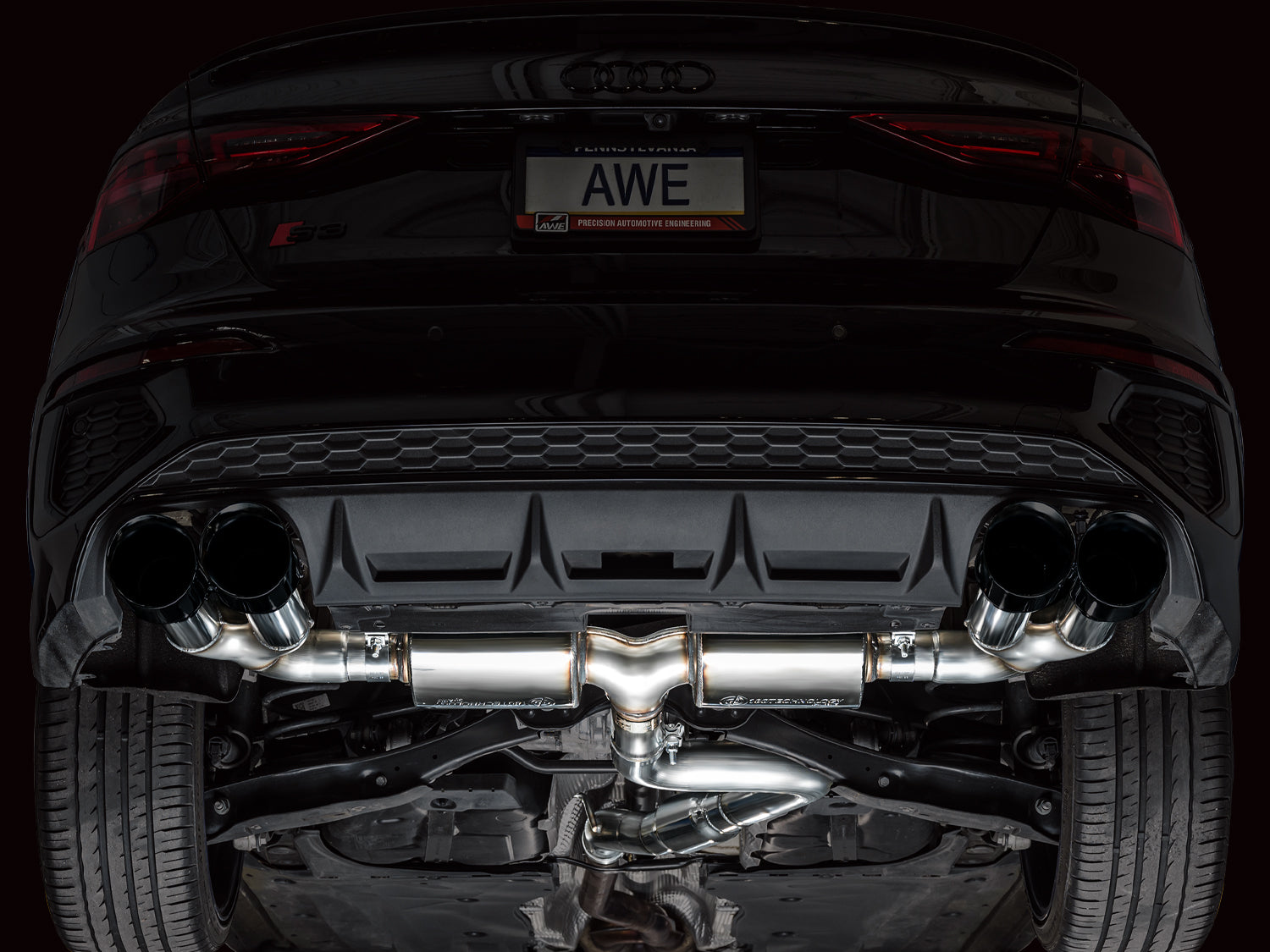Introducing the first AWE Exhaust for the Audi S3 to ever feature patented drone-canceling 180 Technology®. The Touring Edition features a 3" inlet complete with an adapter to accommodate the factory downpipe perfectly while leaving an open 3" connection. In the rear resides AWE's patented 180 Technology® resonators responsible for maintaining straight-through performance while decimating drone-prone frequencies. Thanks to the design and construction of 180 Technology® resonators, the internals will not break down and degrade over time causing tone change. Just full-bodied, drone-free rumble for life from the point of installation. This configuration provides the best ratio of interior refinement and exterior rumble on the market. No valves needed. Switch driving modes and the exhaust will render the same result as a vavled exhaust. It's the do-it-all exhaust for every day drivers. Comes complete with quad 4.5" slash-cut, double-walled tips in diamond black. The AWE Touring Edition for the 8Y S3 is made in the USA and backed by AWE's Fitment Guarantee, 50 state emissions compliance, No Check Engine Light Guarantee, and the AWE Lifetime Warranty.