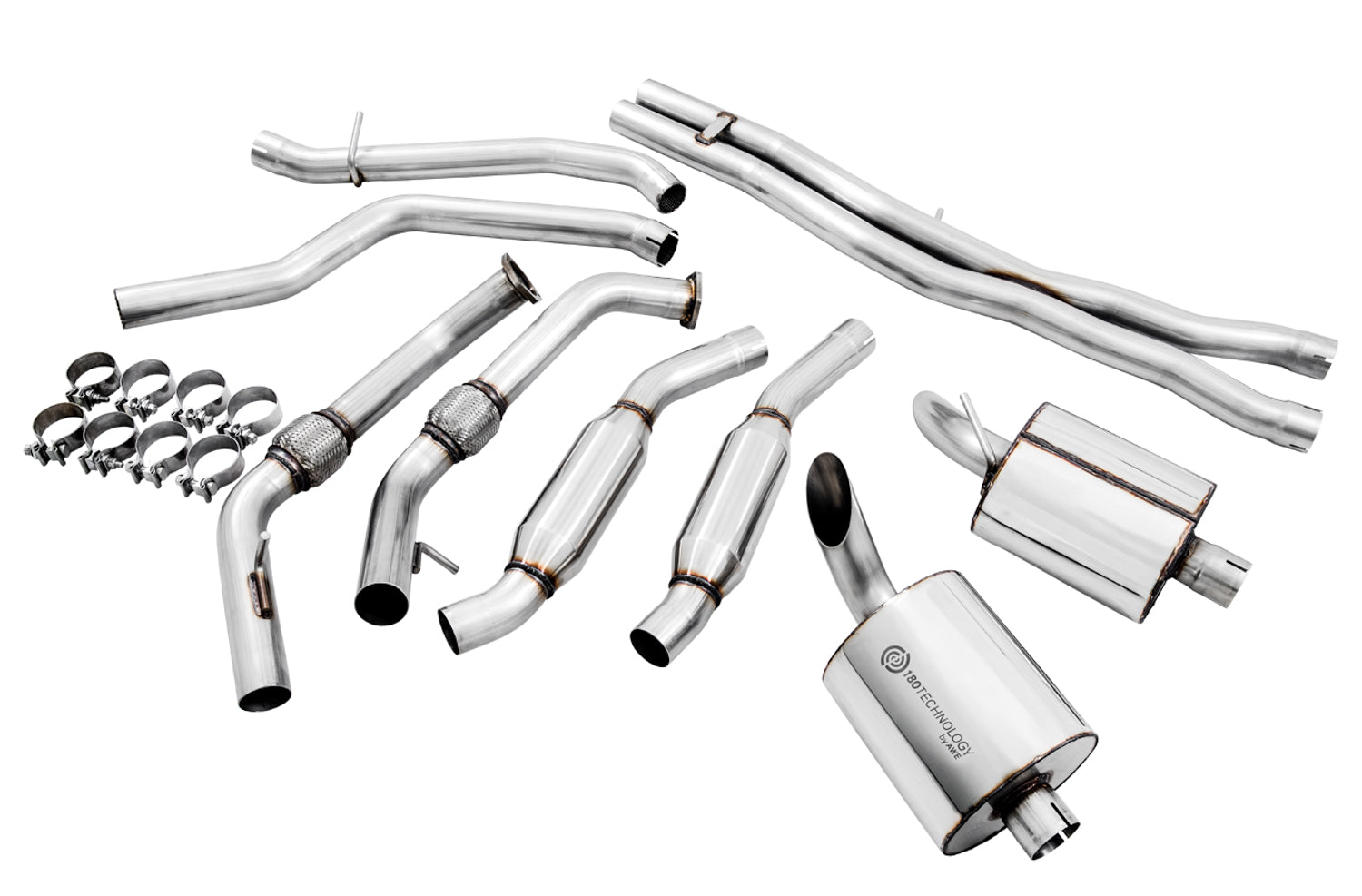 AWE's patented 180 Technology works a little something like this: As exhaust gases exit the engine and flow into an AWE 180 Technology-equipped resonator, they pass through strategically located ports, and into reflection chambers. Sound waves, carried by these exhaust gasses, bounce off the walls of the reflection chambers. Depending on the sound requirements of each vehicle, AWE acoustic engineers adjust the size and location of the ports and the chambers. By controlling the size and location of these key elements, we also control when the sound waves exit the chambers. The specific timing of when the reflected sound waves re-join the main exhaust flow creates a one-hundred-and-eighty-degree out-of-phase sound wave that cancels out problematic frequencies. AWE 180 Technology is not on a one size fits all" concept. Rather, AWE engineers design sound cancelation resonators based upon the specific acoustics generated by vehicle types, thereby ensuring perfect sound, every time. It's one of the reasons AWE exhausts have earned a reputation for the perfect tone, regardless of application. The result? The removal of unwanted tones in all AWE 180 Technology-equipped exhaust systems. The sound produced by this formula is the perfect, signature note. Unlocked performance and spot-on tone, every time.