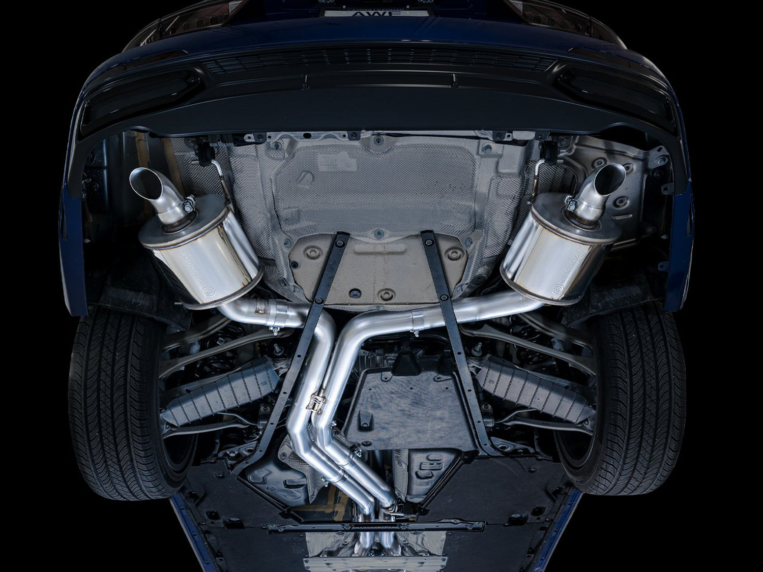 A true dual 3" T304L stainless steel configuration featuring a bespoke, straight-through center resonator, topped off with AWE's proprietary drone-canceling solution, 180 Technology®, in the rear. The result is a menacing, aggressive soundtrack throughout the range with a drone-free cabin experience under cruising conditions. This exhaust resides at the intersection of exotic aggression and highway comfort for the A6/A7. Comes complete with two slip fit turndowns to accomodate the factory valance. AWE No CEL Guarantee, Perfect Fitment Guarantee, and Lifetime Warranty come standard.