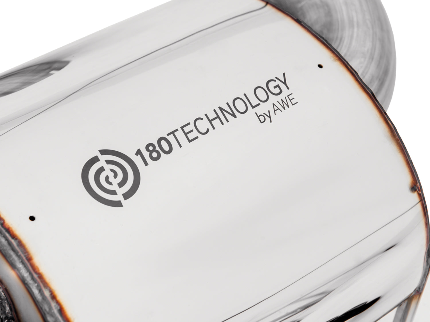 AWE's patented 180 Technology works a little something like this: As exhaust gases exit the engine and flow into an AWE 180 Technology-equipped resonator, they pass through strategically located ports, and into reflection chambers. Sound waves, carried by these exhaust gasses, bounce off the walls of the reflection chambers. Depending on the sound requirements of each vehicle, AWE acoustic engineers adjust the size and location of the ports and the chambers. By controlling the size and location of these key elements, we also control when the sound waves exit the chambers. The specific timing of when the reflected sound waves re-join the main exhaust flow creates a one-hundred-and-eighty-degree out-of-phase sound wave that cancels out problematic frequencies. AWE 180 Technology is not on a one size fits all" concept. Rather, AWE engineers design sound cancelation resonators based upon the specific acoustics generated by vehicle types, thereby ensuring perfect sound, every time. It's one of the reasons AWE exhausts have earned a reputation for the perfect tone, regardless of application. The result? The removal of unwanted tones in all AWE 180 Technology-equipped exhaust systems. The sound produced by this formula is the perfect, signature note. Unlocked performance and spot-on tone, every time.
