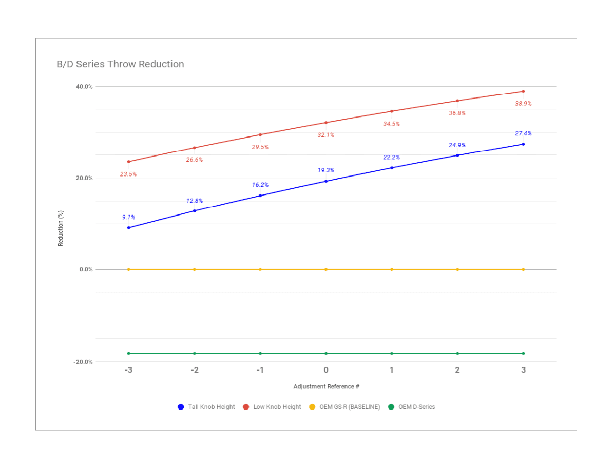 The Hybrid Racing B/D Series Short Shifter is engineered to deliver smooth, precise, and direct gear changes for enthusiasts seeking enhanced shift feel and control. Designed specifically for B-series and D-series engines, this shifter addresses the common shortcomings of stock units by offering a refined shifting experience. Its adjustable throw allows drivers to customize their shift length between 10% and 40%, providing a tailored driving feel that balances speed and comfort. Built for durability and reliability, this shifter is ideal for racers and performance-minded drivers who demand consistent performance from their drivetrain components.Key Features