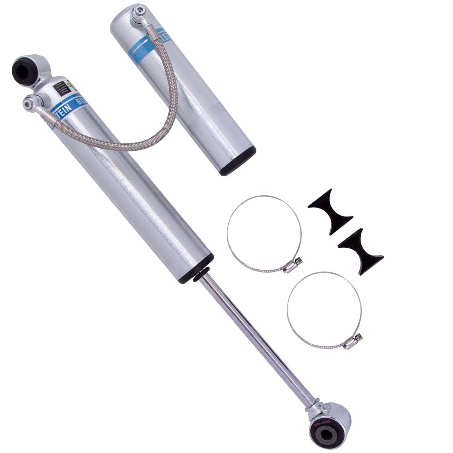 Bilstein B8 5160 remote reservoir shock absorbers are designed as a direct fit solution for lifted trucks and SUV’s. The remote reservoir will offer increased cooling capacity and wheel travel to optimize overall performance compared to a traditional shock absorber. These shock absorbers feature a monotube design for consistent fade free performance and utilize velocity sensitive digressive valve settings which are tuned for each specific application. Each shock absorber is fitted with a unique 360 degree swivel banjo hose fitting, providing a clean, low profile installation. B8 5160 remote reservoir shock absorbers will increase overall durability of your vehicle allowing you to conquer the harshest of off-road environments.