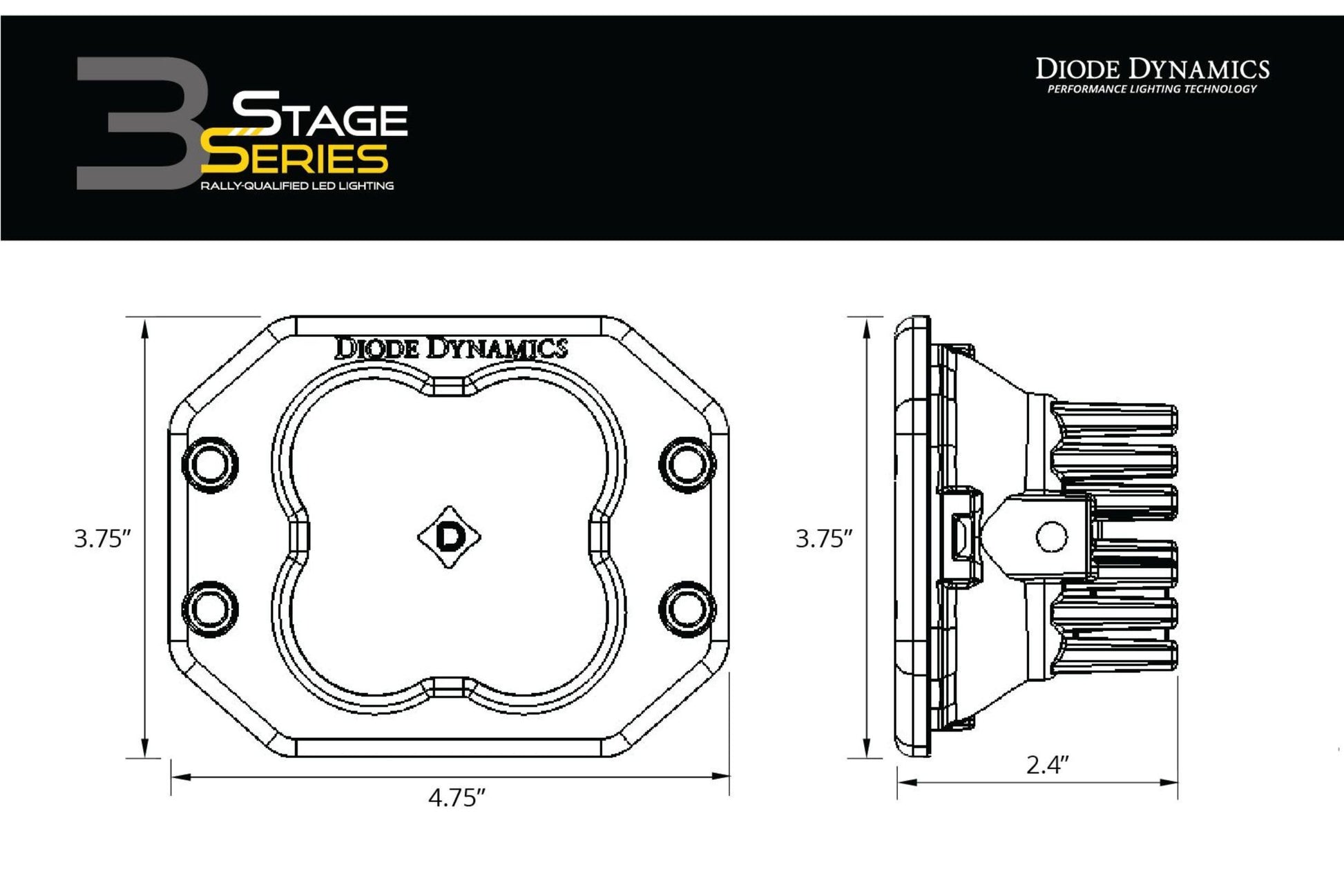 Features: Allows for flush installation on bumpers and truck beds. Advanced TIR optics provide high efficiency and focus. Available in SAE Driving, SAE Fog, Flood, or Spot beam patterns. Pin-fin heatsink design, for superior thermal dissipation. Integrated Deutsch-style connector. Durable powdercoated aluminum construction. Engineered and Assembled in USA. Overview: Add LED pods to your bumper, truck bed, or anywhere else you can think of with our SS3 Flush Mount Pod Kit! Featuring higher output intensity than any other 3inlight on the market, these LED pods have been designed for maximum functionality, with custom-engineered TIR optics shining in highly useful beam patterns, all in a durable package. With the included flush mount bezel, the SS3 Flush Mount Kit is extremely versatile and once installed has a clean, factory-style appearance. Focused: Traditional optics like reflectors or simple lenses lose light internally and to glare, so not all of the light shines on target. Instead, the custom-engineered TIR optic in the SS3 collects all of the light from the LED, and directs it only where you need it, drastically reducing glare and improving total efficiency. From there, while other options on the market lose as much as 10% of the light output shining through an outer lens, the custom-molded TIR optic in the SS3 serves as both the optic and main lens for greater efficiency and light output. Thanks to this innovative feature, when coupled with high-intensity LED chips, the total intensity of the SS3 is much greater than other LED pods using basic optics or reflectors with a standard outer lens. Functional Patterns: All Stage Series beam pattern options were designed with optical simulation model'g, to shape the output in a highly-functional beam pattern. No matter what your auxiliary lighting needs are, there is a Stage Series optic for you! SAE Driving: is designed to supplement your high beams, but it's great for general illumination as well. Rather than a traditional "spot" pattern, the Stage Series Driving pattern shines in an 18x8 degree spread, providing just enough width to fully illuminate the road ahead at high speeds. SAE Fog: provides an extremely wide field of view, with high-intensity output over an entire 80-degree spread. It serves as a great upgrade for any factory foglamp, and will fully illuminate the area in front of your vehicle. Choose your output color of cool white or yellow, which is often said to help cut through inclement weather. Not just off road: When installed as a pair and aimed in accordance with your state's regulations, the Driving White pattern meets SAE J581 standard as a Driving/Auxiliary High Beam Light, and the Fog pattern meets SAE J583 standard as a Foglamp, for legal on-road use. Please check your local laws and regulations for aiming, installation, and applicability. White or Yellow: All Stage Series LED pods are available in a cool white or selective yellow color. The white is a 6000K color temperature, which is a true cool white output, and matches most factory LED lighting. The selective yellow is a 3000K color temperature, great for high contrast in poor weather or a distinctive look on the road. The SS3 Stage Series 3" Yellow LED Pod can be found here. We also offer replacement lenses that allow you to change the color or optic of your SS3 Pods. Sport or Pro: Stage Series LED pods are available at two different power levels. Both options use high-intensity LED emitters, and TIR optics for unmatched focus and overall output. However, the Pro option is double the amount of total power. Click the Specifications tab to see more information or click here. Simple connections: All SS3 LED pods feature a custom-molded DT type Deutsch-style connector on the back, and come with a 6-inch pigtail with bare leads. For installation, you can wire yourself, use an off-the-shelf Deutsch DT sized wire harness, or select an optional Diode Dynamics wire harness. Our Light Duty Dual Output Harness can be used to power up to two SS3 pods. If you are looking to power more than two SS3 pods, we recommend using our Heavy Duty Dual Output Harness along with a Deutsch DT Splitter. Proven Reliability: Stage Series LED lighting has been extensively tested for long-term operation from -40 to 185 degrees F, along with vibration, moisture intrusion, and corrosion testing. All of these tests are completed to SAE standards, just like factory components. They've also been put to the test on-road by racers and enthusiasts alike.