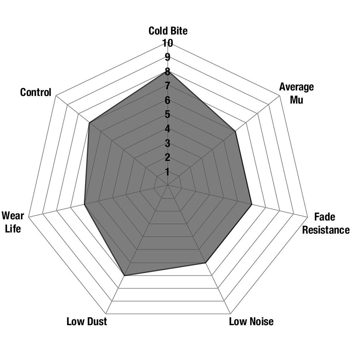 This equates to a clean pad, that lasts longer, extends disc life and emits ZERO toxicity and is a true PAD FOR THE FUTURE. The brake effect with the GG ratting is truly amazing and delivers powerful braking at first brake application.