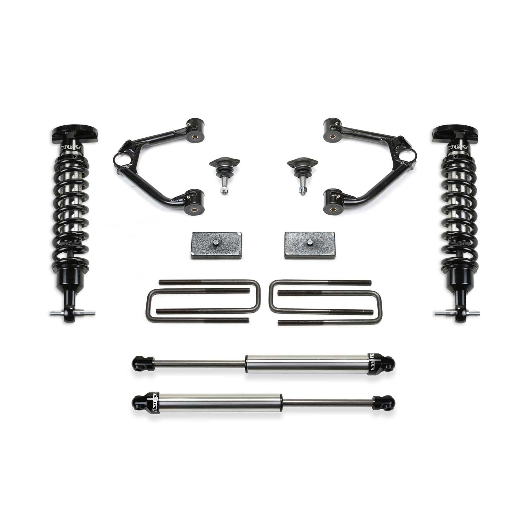 Designed specifically for Trail Boss and AT4 owners that want a little more ride height out of their truck for clearance of full size 33/1250R 18 inch or 20 inch tires, this lift kit is the ticket. Fabtech's Upper Control Arm lift kit provides a 1.5in increased ride height on Trail Boss and AT4 models without creating suspension bind at full droop. These vehicles have a factory 2in lift. With the addition of this 1.5in lift kit, the vehicle will sit as high as a standard model with a 3.5in lift kit and clear a 33in tall tire. This 1.5in lift kit features the legendary stainless steel Dirt Logic 2.5 Coilover shocks. These Coilovers are built of the highest quality materials and will surpass all shocks in corrosion resistance due to the stainless steel body and NitroSteel piston rod. They will provide an outstanding ride quality both on and offroad. The tubular Upper Control Arms with heavy duty ball joints address the geometry of the front suspension with the new ride height for proper alignablity. Due to the new GM suspension geometry of the 2019, there are no differential drop brackets required for the CV axles to operate properly. Rear lift comes from 1in blocks and u bolts. Some owners may opt to not install the rear blocks if they desire to level the stance of the vehicle. The legendary Dirt Logic 2.25 rear shocks are constructed of a stainless steel body with NitroSteel piston rod for maximum corrosion resistance and durability. Superior ride quality both on and offroad. Excellent damping for offroad use. FEATURES: Increased ground clearance, Extended range upper ball joints provide a smooth quiet ride, Increased fender clearance for 33in tall tires, Suspension can be restored to stock, Easy installation.