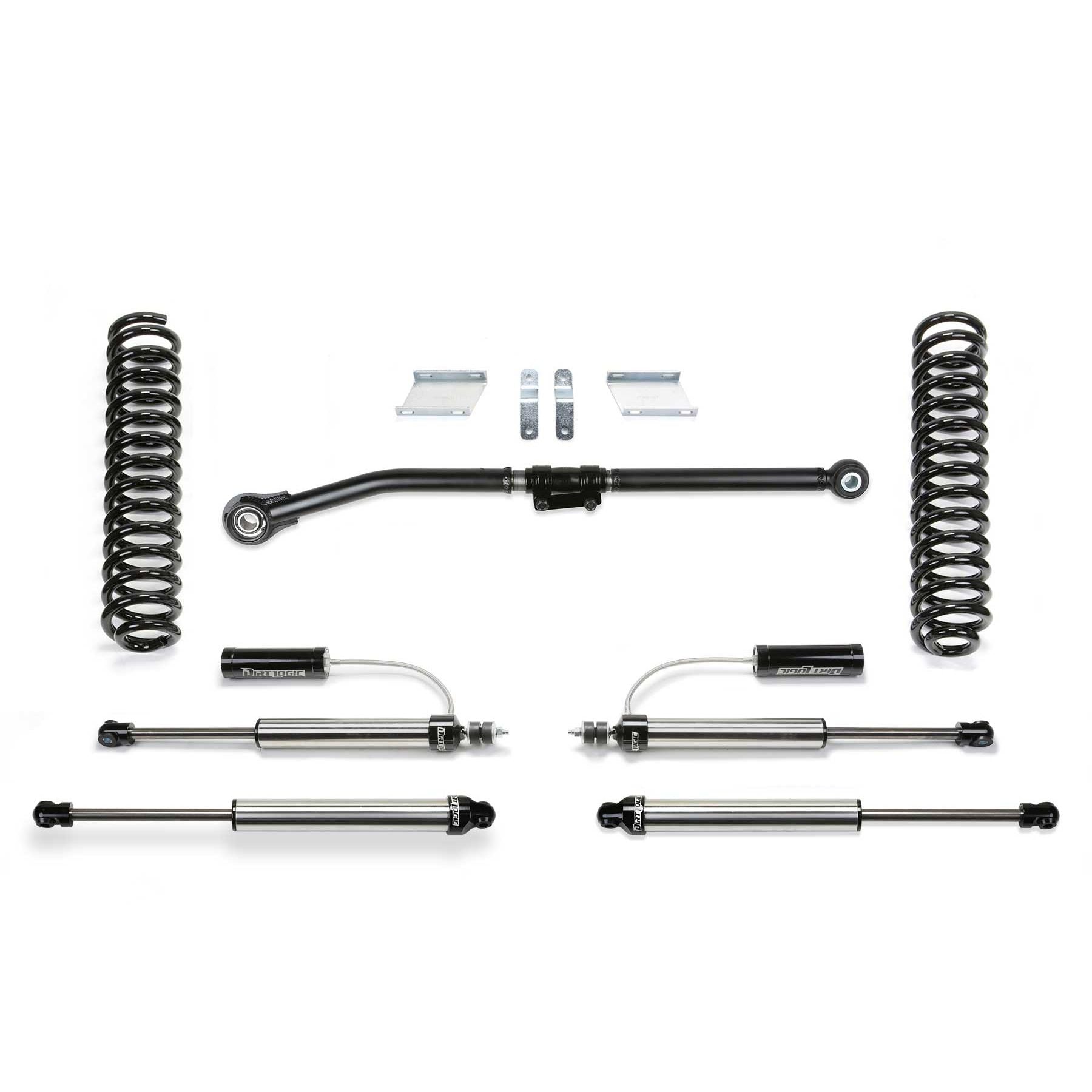 This Super Duty lift kit is perfect for the enthusiast looking to run oversized tires and wants additional Wheel travel for offroad use. With the large Super Duty Wheelwell openings and this quality 2.5in lift kit, you can run 35in tall tires with ease. Fabtech's coil springs retain the factory load carrying capacity while providing increased suspension travel. The coil springs and associated bracketry allow for an additional inch of compression travel over stock without binding the suspension. This extra travel helps when offroading in rugged terrain. Sway bar drop brackets are included to reposition the front bar so that the link ends do not go over center at full droop and cause bind. The brake lines are relocated down on the frame with extension brackets to eliminate the possibility of overstretching the lines throughout the new travel range. Fabtech provides extension brackets rather than longer brake lines to keep the factory brake system sealed for fast and trouble-free installation. This suspension kit utilizes the factory bump stops without extensions. This allows for more travel with the Fabtech coil springs and components. To help keep the factory alignment specifications of the vehicle, Fabtech includes 2 degree adjustable alignment ball joint inserts. They help retain the factory caster specifications for optimum driveability. After a Super Duty is lifted the front axle is pushed to one side due to the length of the track bar. To address this issue Fabtech provides a heavy-duty adjustable track bar. The Fabtech track bar allows for on the vehicle adjustment to center the axle under the vehicle. This provides proper tracking of the front and rear axle for excellent highway manners. This Super Duty lift kit comes with Dirt Logic 2.25 shocks. They are constructed with a stainless steel body and a NitroSteel piston rod for maximum corrosion resistance and durability. They will provide a superior ride quality both on and offroad with excellent damping for of