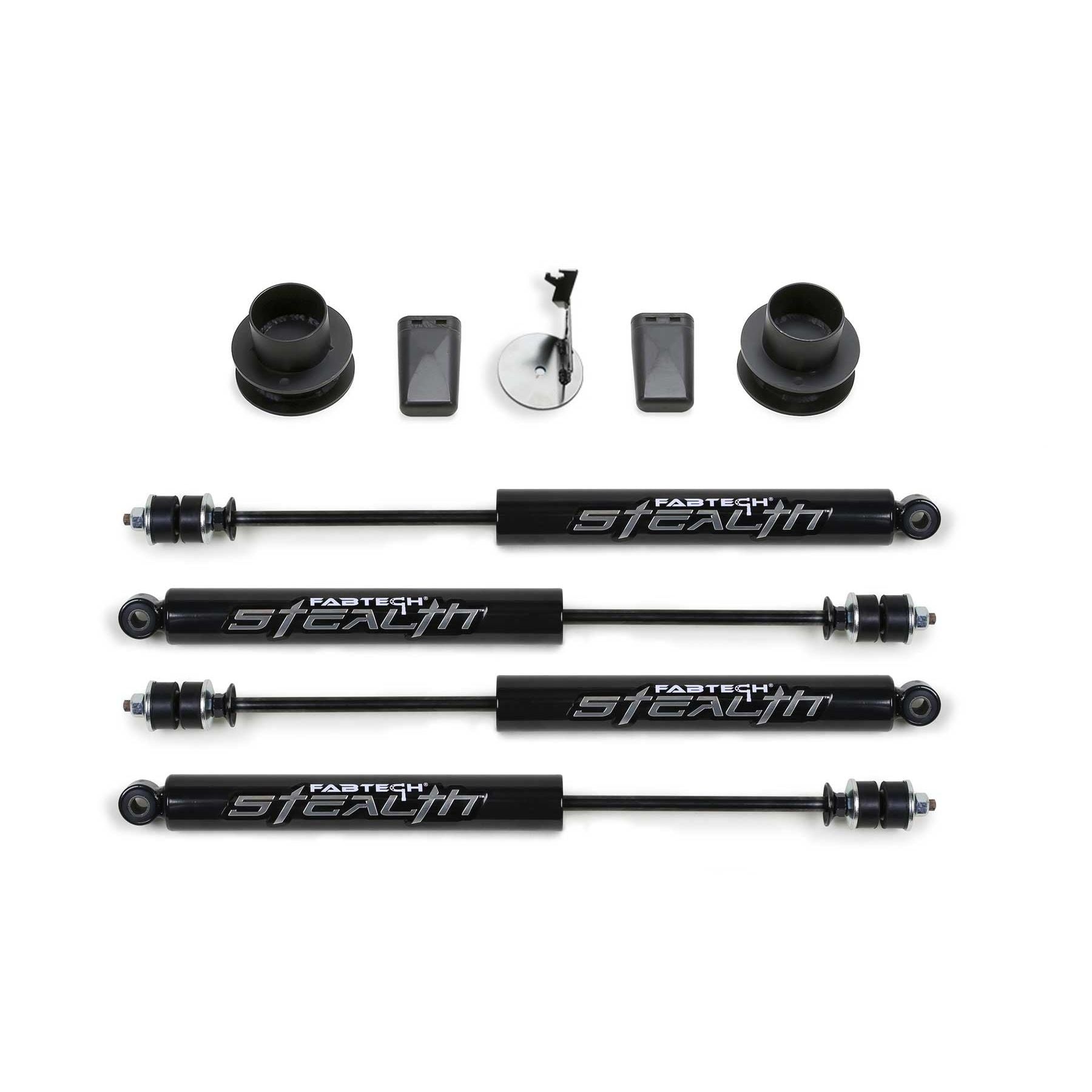 This 2.5in Ram lift kit has been designed to help level the vehicle while keeping the stock ride quality. It's perfect for Ram owners looking for a mild lift to clear 35in tall tires. The factory front Ram coil springs have a purpose built bow in them to aid in vehicle stabilization and handling. Fabtech's exclusive front coil spacers retain the factory coil seat angle and spring bow for stock like ride characteristics. The front shocks are replaced with longer length units to allow for full suspension travel while improving the damping of the Ram suspension. Extended length bump stops are included in this kit to prevent the coils from bind at full compression while eliminating Track Bar interference. The Stealth shocks in this Ram lift kit provide a great highway ride with good offroad damping capacity. This is a great 2.5in lift kit for Ram 2500 owners looking to level their truck and keep the stock ride. FEATURES: Angled Coil Spacers retain proper factory coil bow for handling. Replacement shocks allow for full travel with increased damping. Extended length bump stops eliminate coil bind and track bar interference. Comes with free 5 year 60,000 Mile Powertrain Warranty.