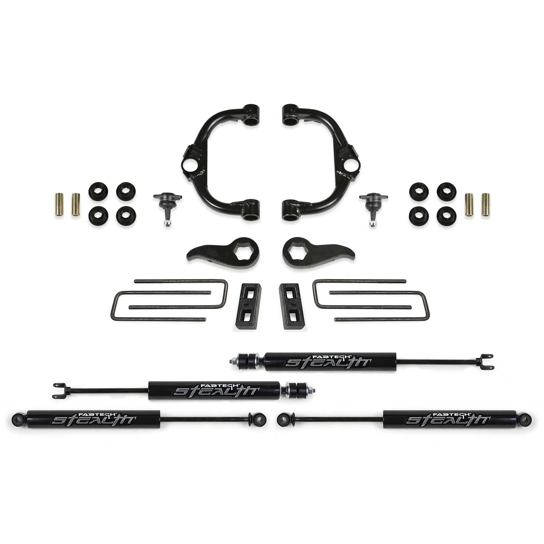 This high quality GM 3500HD lift kit offers an increased ride height for enthusiasts looking to run a 35in tall tire with enhanced offroad capabilities. The stance of the vehicle will become more level front to rear for an aggressive look. The factory GM upper control arms are replaced with Fabtech's heavy duty ball joint tubular arms. They are constructed with 1.50in OD DOM steel tubing and feature a high travel ball joint that is sizably larger than stock. This provides for increased strength both on and offroad. Fabtech sets the ball joint angle to allow for full travel without bind throughout the travel range. Fabtech's forged torsion bar keys replace the factory units and allow for additional ride height adjustment to work in conjunction with the new upper control arms. The rear receives 2in blocks and U-bolts to help level the stance of the vehicle. Fabtech offers their Stealth shocks with this suspension. They are a sealed monotube shock that has a Nitrocarb piston rod for corrosion resistance and resist rock chipping. They will provide a great highway ride with good offroad damping capacity. This 3.5in HD lift kit comes with high quality components that add strength and reliability to the vehicle while giving it a commanding presence. Tubular Steel Upper Control Arms. Additional 1 degree of caster built in. 1.5in OD x .120in wall DOM tubing. High travel oversized ball joint. 2.25in OD x .250in wall DOM bushing barrels. Heavy duty forged torsion bar keys.