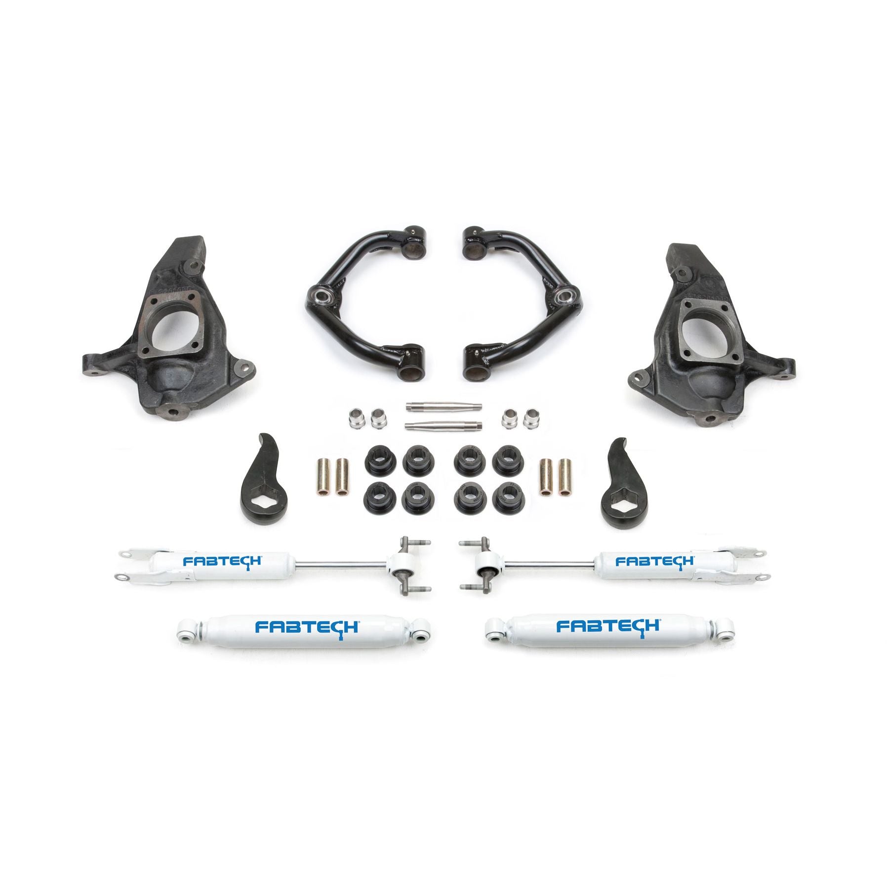 The 4'' Ultimate System is available with our Uniball Upper Control Arms that feature .120'' wall 4130 Chromoly tubing with a 1.50'' OD 1'' FK Stainless PTFE Uniballs for 9'' of front Wheel travel. The system also includes heavy duty ductile iron steering knuckles and forged adjusting torsion bar keys to provide the proper amount of lift without CV bind. The system will level the stance of the vehicle compared to the factory nose down rake with no change to the rear suspension. For those customers that require a factory nose down appearance an optional 1'' rear block kit is available. Uniball Upper Control Arms are available separately as an upgrade to stock, previously installed Fabtech'suspensions or other aftermarket suspension systems.