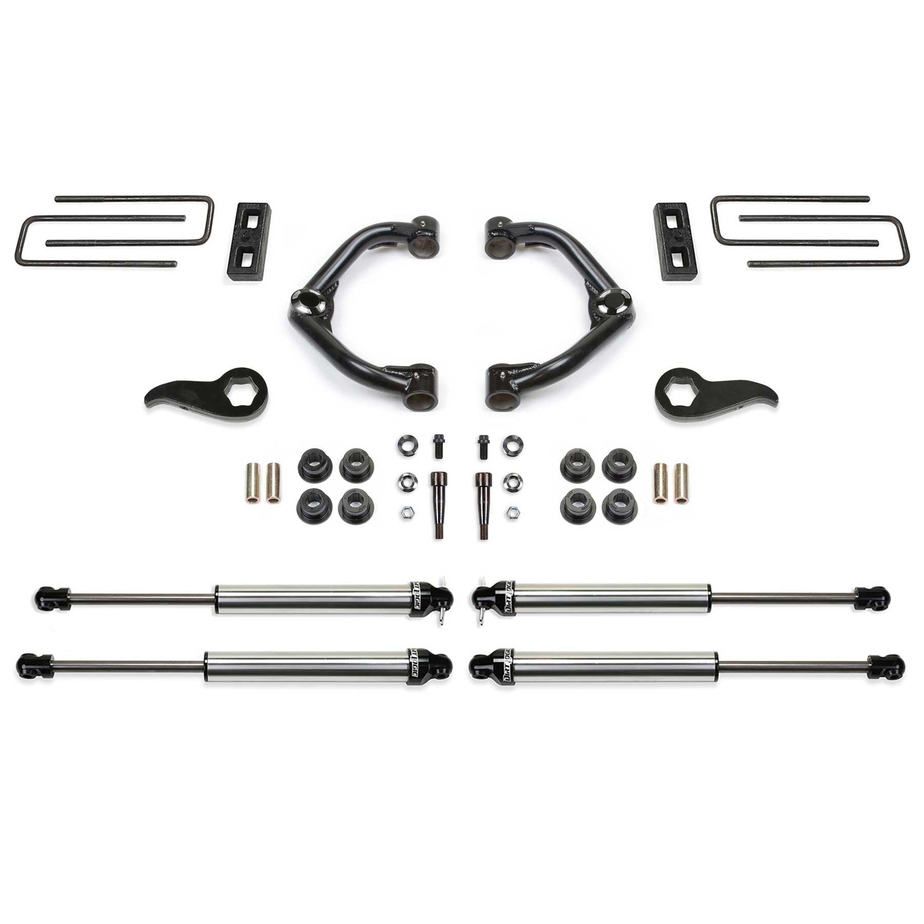 This high quality GM 3500HD lift kit offers an increased ride height for enthusiasts looking to run a 35in tall tire with enhanced offroad capabilities. The stance of the vehicle will become more level front to rear for an aggressive look. The factory GM upper control arms are replaced with Fabtech's Uniball Upper Control Arms that provide additional Wheel travel with an extra degree of caster compared to stock UCA's. They are constructed of the finest material with .120in wall 1.50in OD 4130 Chromoly tubing. High quality 1in FK Stainless PTFE lined Uniball bearings are utilized in place of ball joints. These super stout Control Arms are designed for increased longevity in rugged offroad conditions while providing a more positive on road feel. Fabtech's forged torsion bar keys replace the factory units and allow for additional ride height adjustment to work in conjunction with the new upper control arms. The rear receives 2in blocks and U-bolts to help level the stance of the vehicle. Fabtech offers their top of the line Dirt Logic 2.25 shocks with this 3500HD lift kit. They are constructed with a stainless steel body and a NitroSteel piston rod for maximum corrosion resistance and durability. These high quality Dirt Logic shocks will provide a superior ride quality both on and offroad with excellent damping for offroad use. This 3.5in HD lift kit comes with high quality components that add strength and reliability to the vehicle while giving it a commanding presence. Fabtech UCA's eliminate factory upper ball joint with super strong 1in ID Stainless Steel American Uniball for increased suspension strength. Additional caster is built into Arms for enhanced align ability with oversized tires. 1.50in OD .120in wall 4130 Chromoly tubing reduces flex found in stock arms for more positive road feel. 17-4 Heat treated Uniball pin fits into factory ball joint taper without modification to the spindle for easy return to stock feature. 17-4 Stainless steel misalignments for