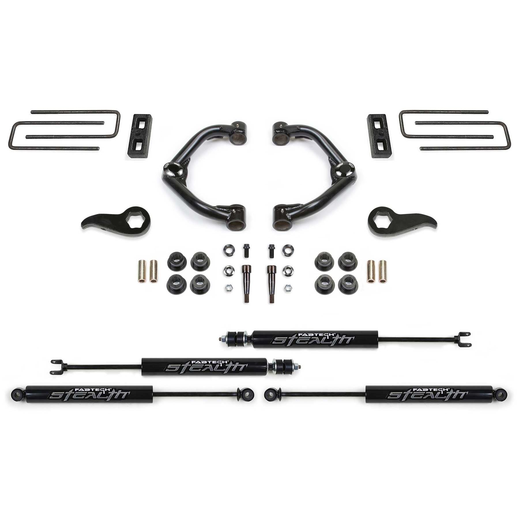 This high quality GM 3500HD lift kit offers an increased ride height for enthusiasts looking to run a 35in tall tire with enhanced offroad capabilities. The stance of the vehicle will become more level front to rear for an aggressive look. The factory GM upper control arms are replaced with Fabtech's Uniball Upper Control Arms that provide additional Wheel travel with an extra degree of caster compared to stock UCA's. They are constructed of the finest material with .120in wall 1.50in OD 4130 Chromoly tubing. High quality 1in FK Stainless PTFE lined Uniball bearings are utilized in place of ball joints. These super stout Control Arms are designed for increased longevity in rugged offroad conditions while providing a more positive on road feel. Fabtech's forged torsion bar keys replace the factory units and allow for additional ride height adjustment to work in conjunction with the new upper control arms. The rear receives 2in blocks and U-bolts to help level the stance of the vehicle. Fabtech offers their Stealth shocks with this suspension. They are a sealed monotube shock that has a Nitrocarb piston rod for corrosion resistance and resist rock chipping. They will provide a great highway ride with good offroad damping capacity. This 3.5in HD lift kit comes with high quality components that add strength and reliability to the vehicle while giving it a commanding presence. Fabtech UCA's eliminate factory upper ball joint with super strong 1in ID Stainless Steel American Uniball for increased suspension strength. Additional caster is built into Arms for enhanced align ability with oversized tires. 1.50in OD .120in wall 4130 Chromoly tubing reduces flex found in stock arms for more positive road feel. 17-4 Heat treated Uniball pin fits into factory ball joint taper without modification to the spindle for easy return to stock feature. 17-4 Stainless steel misalignments for proper clearance of large Uniballs throughout the travel range. Billet Uniball cap keeps dirt and