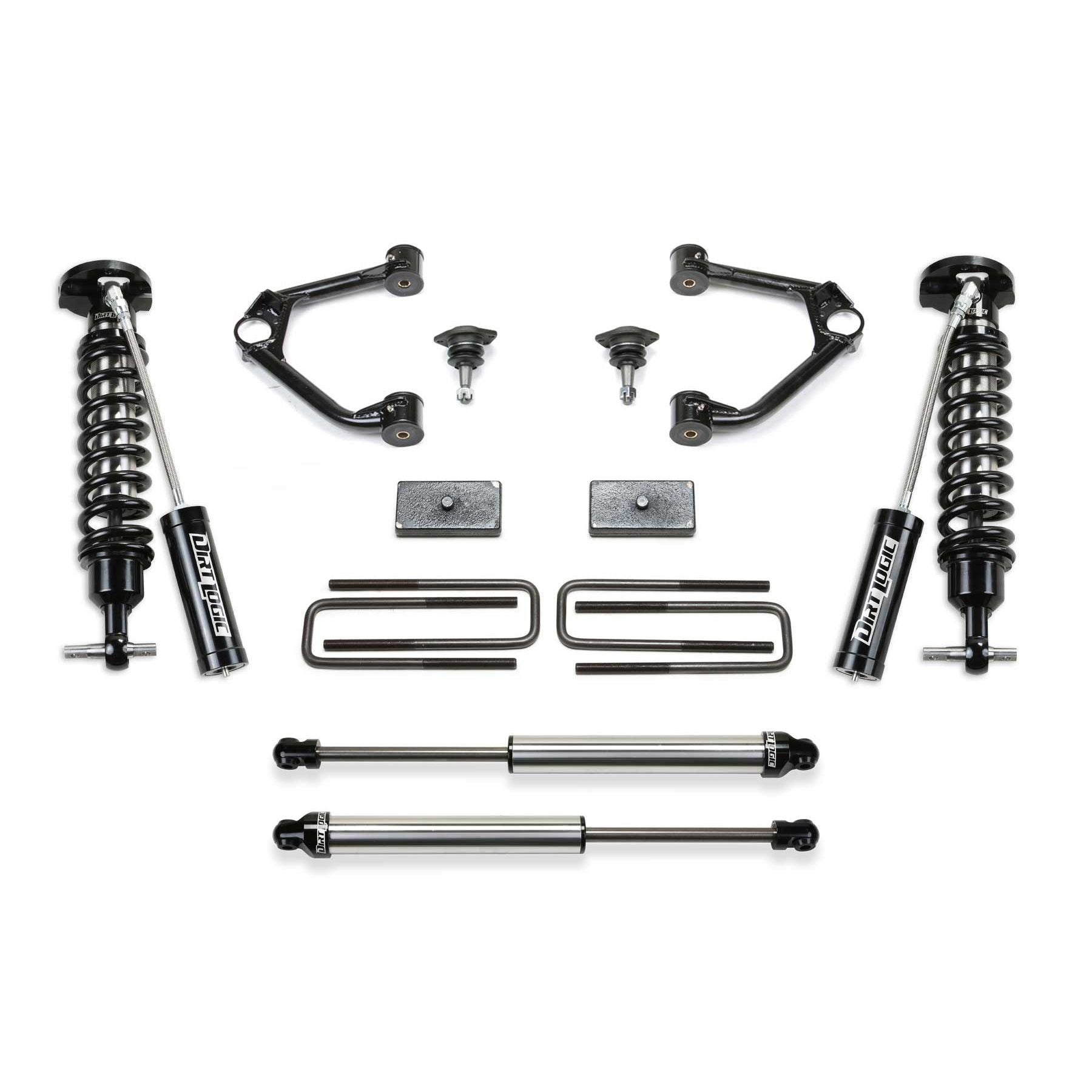 This quality Upper Control Arm system for the 2019 Chevy Silverado 1500 & GMC Sierra 1500 4WD provides a 3.5in increased ride height over stock without creating suspension bind at full droop. Lift is accomplished with spacers that utilizes the factory coilover shocks for a stock ride. The Fabtech Upper Control Arms address the geometry of the front suspension with the new ride height for proper align-ability. Heavy duty ball joints allow for extended travel to eliminate binding. Due to the GM suspension geometry there are no differential drop brackets required for the CV axles to operate properly. This 3.5in system features the legendary stainless steel Dirt Logic 2.5 Coilover shocks. These Coilovers are built of the highest quality materials and will surpass all shocks in corrosion resistance due to the stainless steel body and NitroSteel piston rod. They will provide an outstanding ride quality both on and offroad. Rear lift comes from 1.5in blocks and u-bolts with Dirt Logic 2.25 shocks for a balanced ride. Dirt Logic shocks are the only stainless steel body shock on the market that provide maximum corrosion resistance in harshest conditions. Features increased ground clearance, extended range upper ball joints provide a smooth quiet ride, increased fender clearance compared to a Leveling Kit for 33in tall tires, suspension can be restored to stock, easy installation.