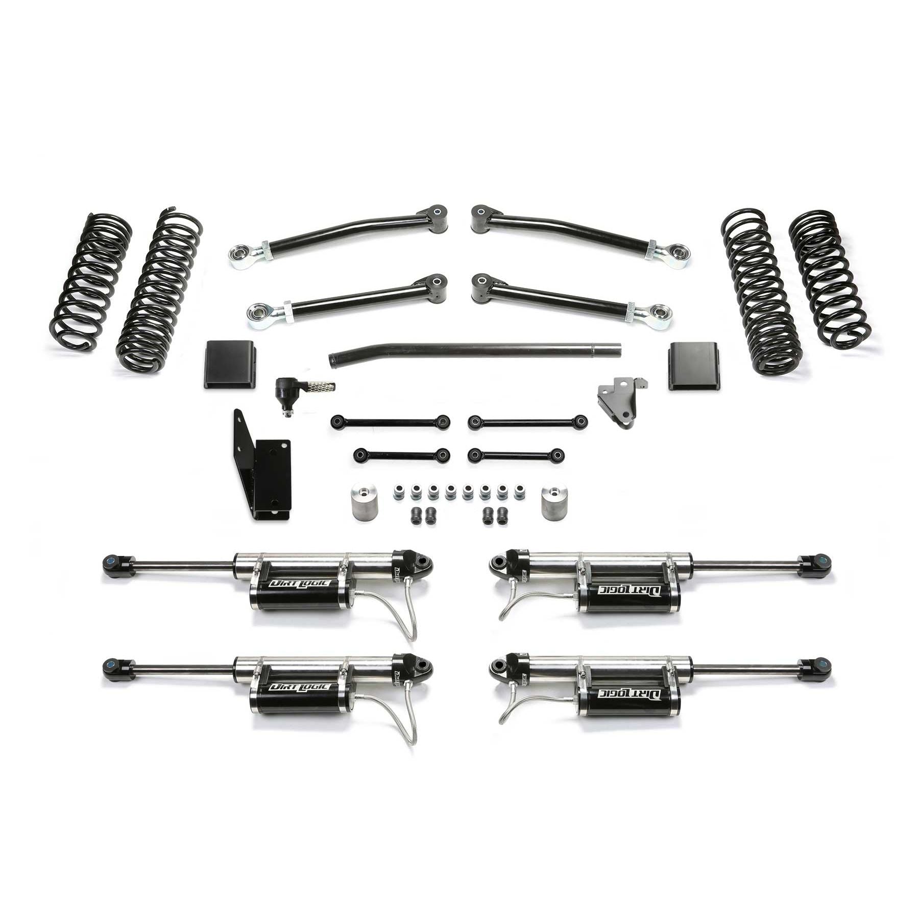 This Trail Lift Kit provides enhanced suspension performance to address all variants of off highway travel use including rock crawling, aggressive trail use and overland expeditions. This Gladiator lift kit has been tuned with proper dual rate coil springs and shock valving to provide a very compliant ride that you will appreciate. The system is a complete short arm suspension that utilizes the factory lower control arm mounts for an easy installation. The Fabtech lower link arms are constructed of thick wall steel tubing that are guaranteed never to bend. They come with large polyurethane bushings on one end with internal threads on the other to accept the groundbreaking Fabtech 5 Ton Joint for longevity and a quiet ride. Fabtech's dual rate Gladiator coil springs are corner specific to the Jeep JT. This keeps the vehicle level side to side and allows for increased suspension travel. The first stage of the spring provides a soft ride with the ability to extend for additional travel. The second stage is designed to handle the payload of the vehicle and address large impact absorption at higher speeds. To address the steering geometry with the increased ride height, a Draglink Flip kit along with a heavy duty Track Bar bracket is included. This relocates the Gladiator steering geometry to the factory plane allowing for full articulation without binding the draglink ends in extreme conditions. The rear Gladiator suspension receives a heavy duty Track Bar bracket to center the axle under the vehicle with the new ride height and help retain the factory roll center of the vehicle. Front and rear bumps stop extensions protect the Jeep Gladiator suspension from over cycling. This popular Jeep Gladiator lift kit is a top choice for daily drivers that enjoy tackling tough trails and overlanding with the comfort that they have a high quality complete suspension under their Gladiator. Each Fabtech component has been designed with specific features and benefits that crea