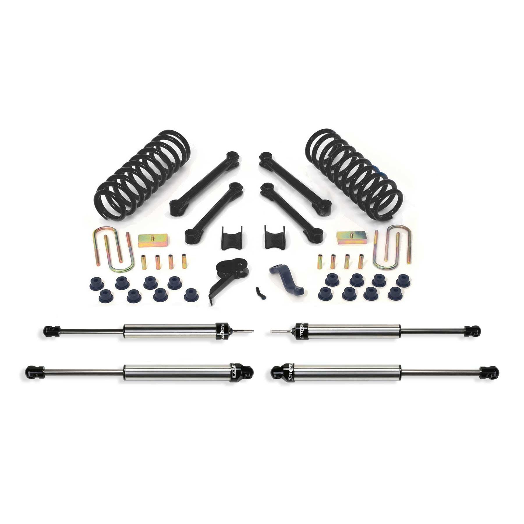 This system includes our replacement front coil springs providing increased ride height and large 1 3/4'' diameter upper and lower control links replace stock units for proper caster and increased strength. Includes front 2.5 Dirt Logic Stainless Steel coil over shocks, rear 2.25 Dirt Logic Stainless Steel shocks, Pitman Arm, Trac bar bracket, Bump Stops, and a rear block and u-bolt kit.