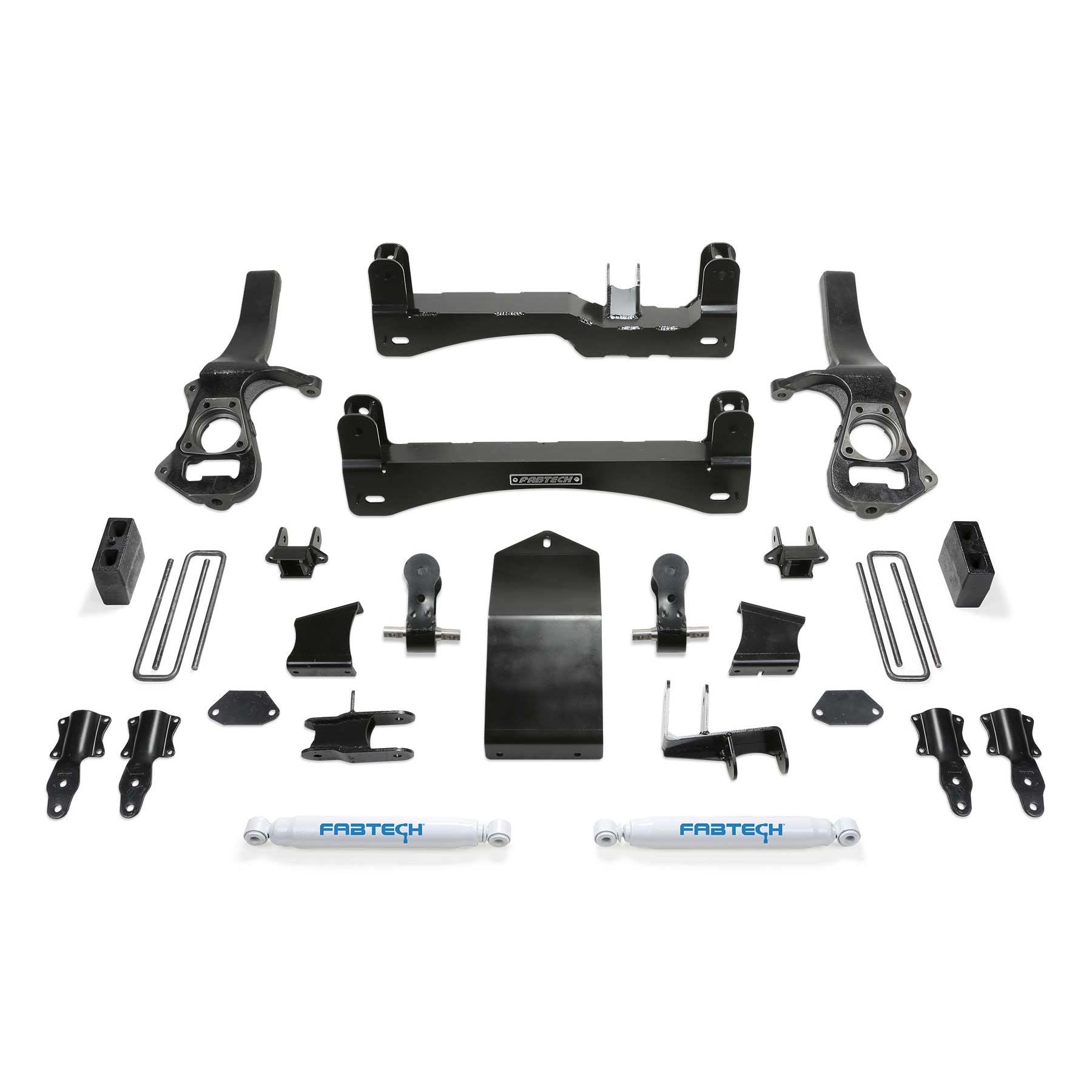The Chevrolet Trail Boss and GMC AT4 both have a factory 2in lift compared to other GM 1500 trucks of the same year model. Fabtech's suspension system for these two trucks provide a 4in lift height on top of the factory 2in lift for clearance of 35in tall tires. Once a Trail Boss or AT4 is lifted with a Fabtech 4in system, the truck will sit the same height as a 1500 with a 6in suspension and 35in tires.Fabtech's suspension design for the Trail Boss and AT4 provides excellent drive ability both on and offroad. There is zero bump steer throughout the suspension cycle that helps reduce drive fatigue while improving the overall drive ability of the vehicle.The near stock track width keeps the tires under the fenders for a clean appearance. Fabtech's proprietary steering knuckle geometry provides excellent lock to lock turning radius to maneuver in tight spots.Heavy duty 1/4in thick steel crossmembers feature OE style alignment cam pins that utilize the factory cams for easy adjustment. Triple front diff mounts reposition the differential for vibration free operation at high speed.The factory Trail Boss and AT4 coilover shocks are retained and relocated from the bottom to allow for full steer while achieving 4in of lift. Rear lift is accomplished by removing the factory 2in block and replacing it with a 5in block and u-bolt system.Fabtech has addressed all aspects of the Trail Boss suspension for proper Wheel travel and lock to lock steering without over cycling. Comes with a free 5 year 60,000 mile Powertrain Warranty.