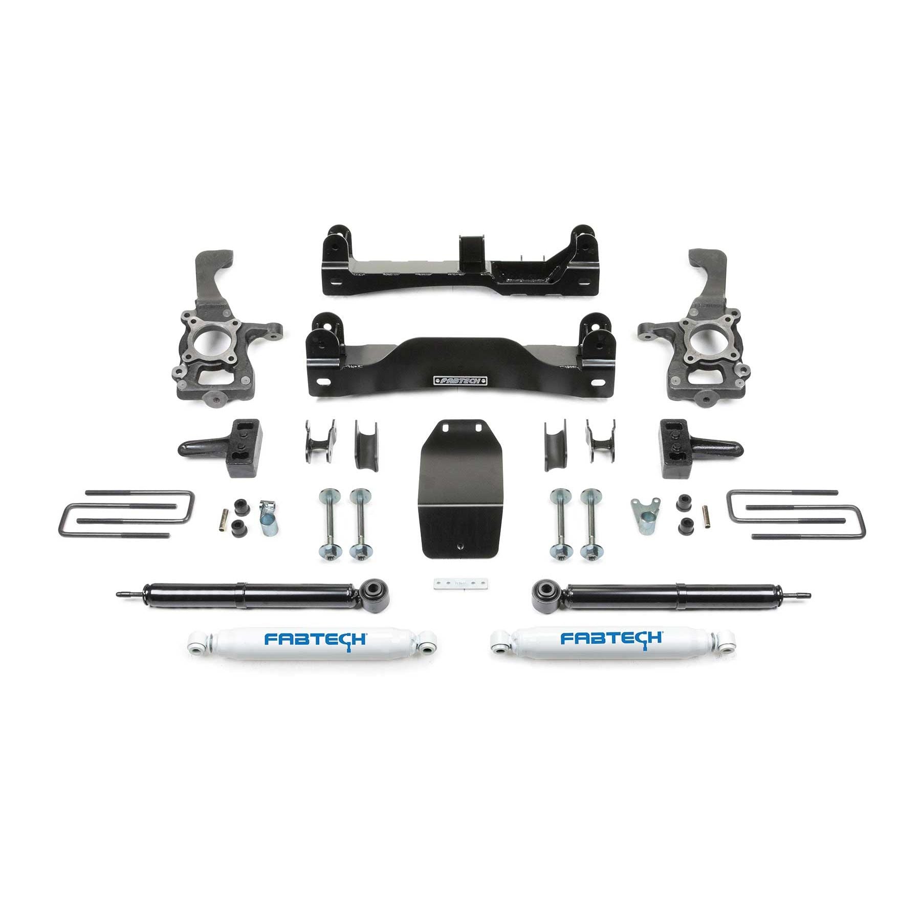 Fabtech's new 4in F150 Basic system utilizes their proven heavy duty construction and design features found in their 6in systems but with less lift and at a much lower price. This Basic system includes heavy duty front Coilover shocks for increased damping capacity while retaining the factory coil springs. The high arched lower control arm crossmembers are constructed of 1/4in thick steel for maximum strength. The Fabtech ductile iron steering knuckles retain the stock track width keeping tires under the fender for a clean appearance. Rear lift is accomplished with a block and u bolt configuration. Includes Fabtech Performance twintube rear shocks. High quality Fabtech construction with a low price. 1/4in thick steel lower control arm crossmembers and skid plate. Allows use of 33in or 35in tires. ESC and Traction Control Compliant. Estimated installation time- 3-4 hours. No holes to drill. No welding required. No driveshaft modification required.