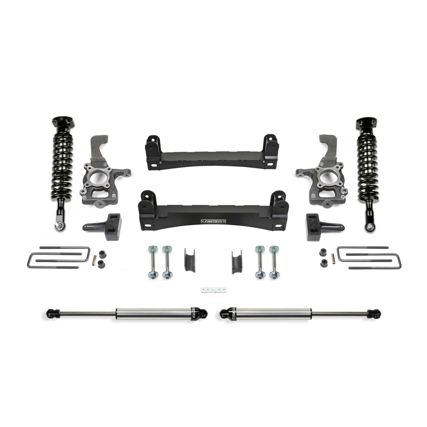 This system feature Fabtech's proven IFS technology with extended length ductile iron steering knuckles for proper Ford electronic stability control functionality. Heavy duty 1/4in thick steel lower control arm crossmembers provide superior ground clearance for adventurous offroad trails. Rear lift is accomplished with a 2.25in lift block and extended length u bolts. The Performance system includes Fabtech's legendary stainless steel Dirt Logic 2.5 Coilover shocks for outstanding damping capacity with a great highway ride. Rear shocks include the Dirt Logic 2.25. This high quality system does not require drilling or cutting for installation and comes Fabtech's 5/60 Powertrain warranty. 1/4in thick steel lower control arm crossmembers are arched for maximum ground clearance. Four adjustable alignment cams provide a wide range of adjustment. The fully welded box design of these crossmembers provides additional strength to the front suspension. Extended length ductile iron steering knuckles retain near stock track width keeping the tires under the fenders. These steering knuckles are designed to work in conjunction with the Ford ESC for proper functionality at all speeds. The Brake Line Brackets reposition the factory Ford brake lines down on the frame for the new travel range without having to open the brake system. Keeps factory fluid system intact. 1/4in thick steel drop brackets reposition the front sway bar for the increased ride height. This allows the sway bar link ends to fully cycle without binding throughout the extended travel range. 2.25in Tall rear lift blocks replace the factory blocks without changing the ride quality or load carrying capacity. American made U Bolts that retain the entire rear differential to the vehicle. A critical part that demands the best quality for your vehicle.