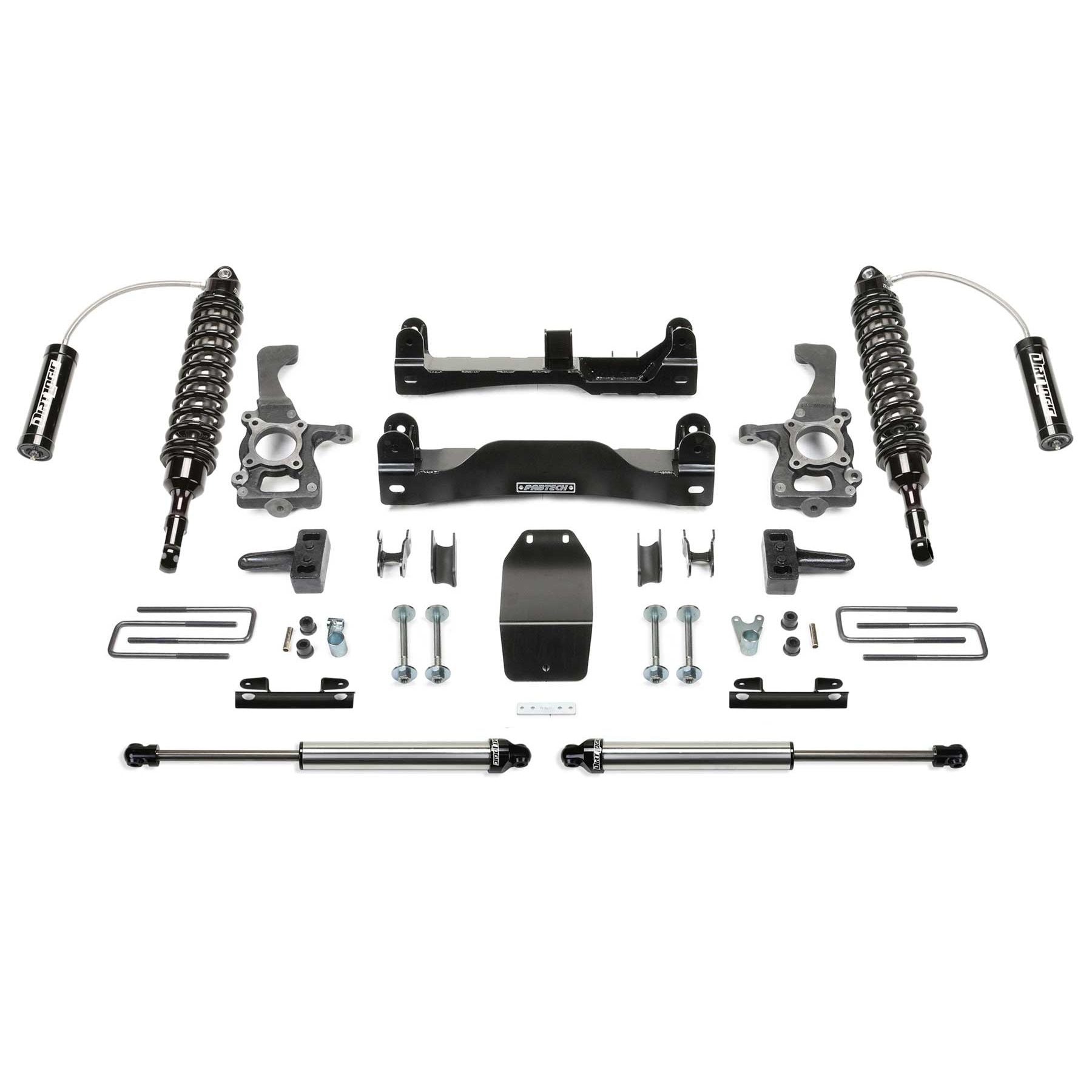 Fabtech's 4'' F150 system utilizes their proven heavy duty construction and design features found in their 6'' systems but with less lift and at a much lower price. This 4'' System allows use of 35'' tall tires and features high arched lower control arm crossmembers constructed of 1/4 “ thick steel for maximum strength. The Fabtech ductile iron steering knuckles retain the stock track width keeping tires under the fender for a clean appearance. Rear lift is accomplished with a block and u-bolt configuration. The Performance System features Dirt Logic 2.5 Coilover front shocks and Dirt Logic 2.25 rear shocks for aggressive offroad capabilities with a smooth highway ride. The 4'' System allows use of 33'' or 35'' tires and is ESC (Electronic Stability Control) and Traction Control compliant.