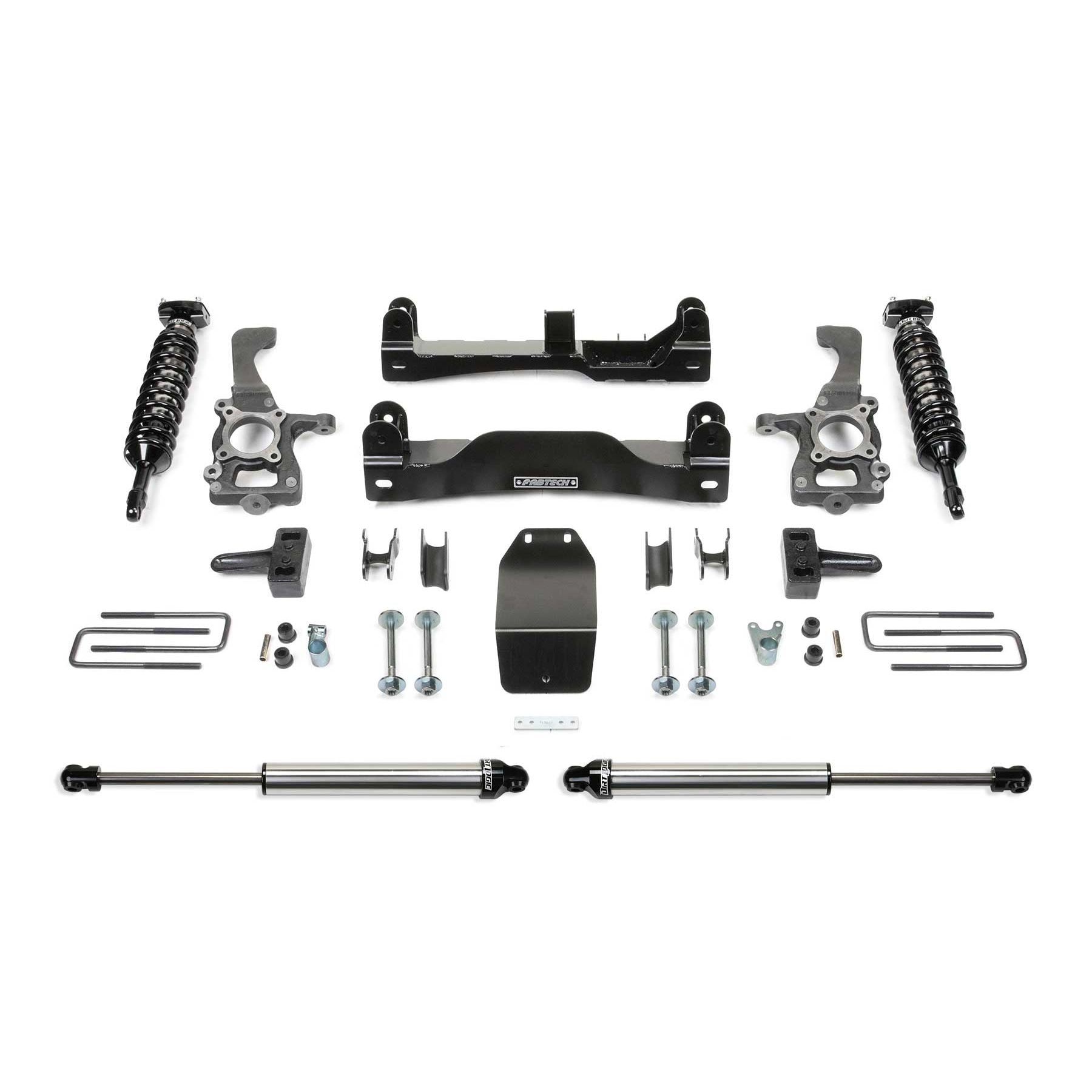 Fabtech's new 4'' F150 system utilizes their proven heavy duty construction and design features found in their 6'' systems but with less lift and at a much lower price. This 4'' System allows use of 35'' tall tires and features high arched lower control arm crossmembers constructed of 1/4in thick steel for maximum strength. The Fabtech ductile iron steering knuckles retain the stock track width keeping tires under the fender for a clean appearance. Rear lift is accomplished with a block and u-bolt configuration. The Performance System features Dirt Logic 2.5 Stainless Steel Coilover front shocks and Dirt Logic 2.25 Stainless Steel rear shocks for aggressive offroad capabilities with a smooth highway ride. The 4'' System allows use of 33'' or 35'' tires and is ESC (Electronic Stability Control) and Traction Control compliant.