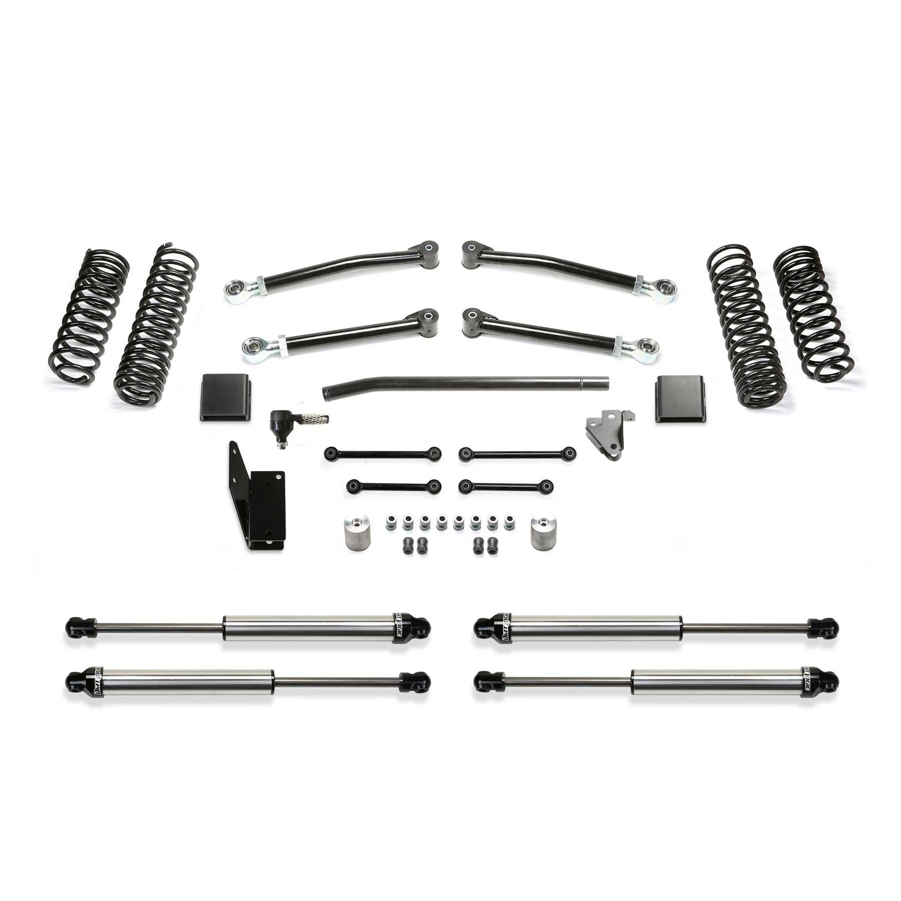 This Trail Lift Kit provides enhanced suspension performance to address all variants of off highway travel use including rock crawling, aggressive trail use and overland expeditions. This Gladiator lift kit has been tuned with proper dual rate coil springs and shock valving to provide a very compliant ride that you will appreciate. The system is a complete short arm suspension that utilizes the factory lower control arm mounts for an easy installation. The Fabtech lower link arms are constructed of thick wall steel tubing that are guaranteed never to bend. They come with large polyurethane bushings on one end with internal threads on the other to accept the groundbreaking Fabtech 5 Ton Joint for longevity and a quiet ride. Fabtech's dual rate Gladiator coil springs are corner specific to the Jeep JT. This keeps the vehicle level side to side and allows for increased suspension travel. The first stage of the spring provides a soft ride with the ability to extend for additional travel. The second stage is designed to handle the payload of the vehicle and address large impact absorption at higher speeds. To address the steering geometry with the increased ride height, a Draglink Flip kit along with a heavy duty Track Bar bracket is included. This relocates the Gladiator steering geometry to the factory plane allowing for full articulation without binding the draglink ends in extreme conditions. The rear Gladiator suspension receives a heavy duty Track Bar bracket to center the axle under the vehicle with the new ride height and help retain the factory roll center of the vehicle. Front and rear bumps stop extensions protect the Jeep Gladiator suspension from over cycling. This popular Jeep Gladiator lift kit is a top choice for daily drivers that enjoy tackling tough trails and overlanding with the comfort that they have a high quality complete suspension under their Gladiator. Each Fabtech component has been designed with specific features and benefits that crea