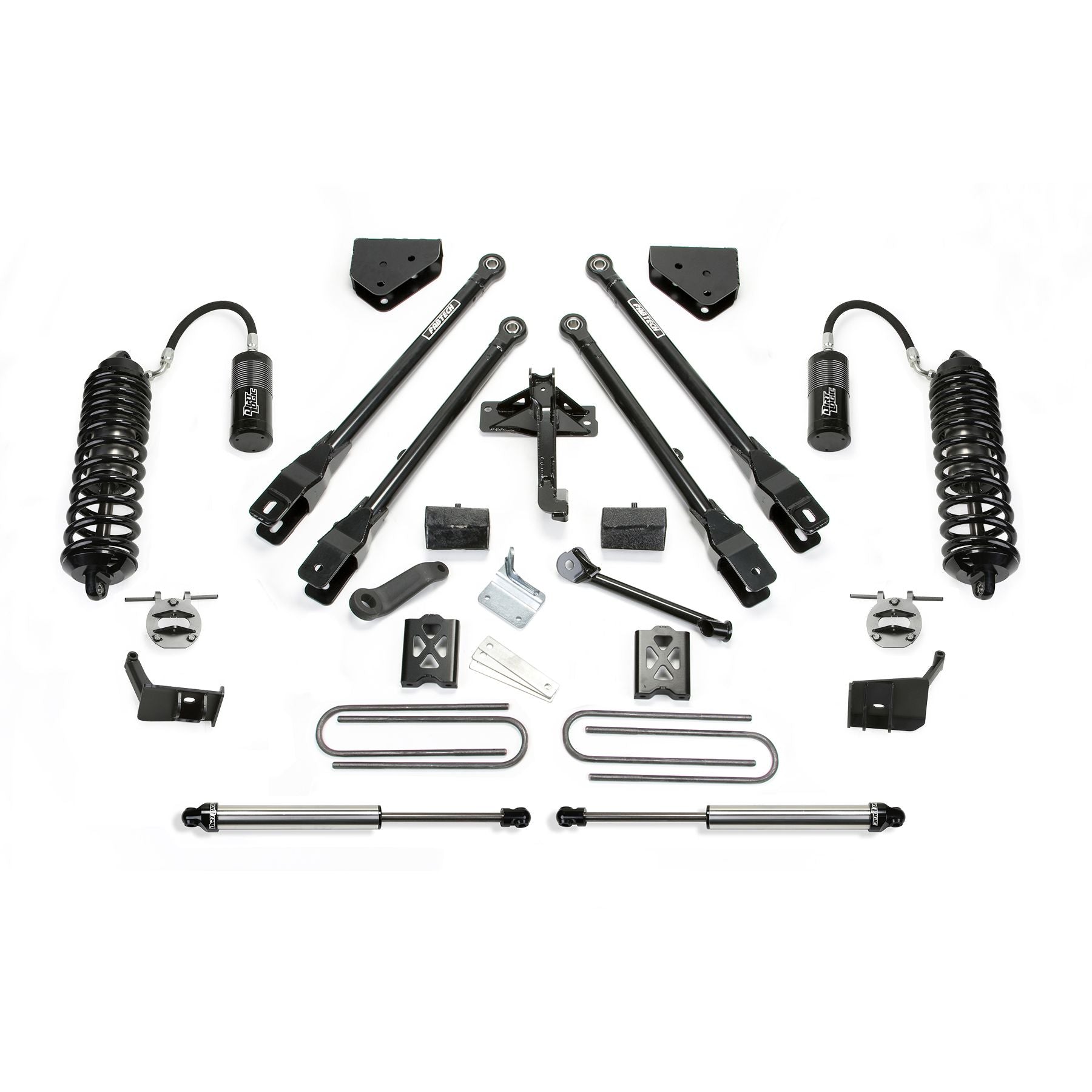 Fabtech continues its legendary Coilover Conversion systems with an all new design for the 2011-16 Super Duty. This new system utilizes the factory coil spring bucket for a fast, easy installation with an affordable price. The heavy duty bracketry allows the installation of the massive Dirt Logic 4.0 Remote Resi Coilover shocks. Dirt Logic Coilovers are constructed with a Stainless Steel body and NitroSteel piston rod for maximum corrosion resistance. The Dirt Logic 4.0 for 6in lift systems feature dual rate coil springs for a superior quality both on and offroad.