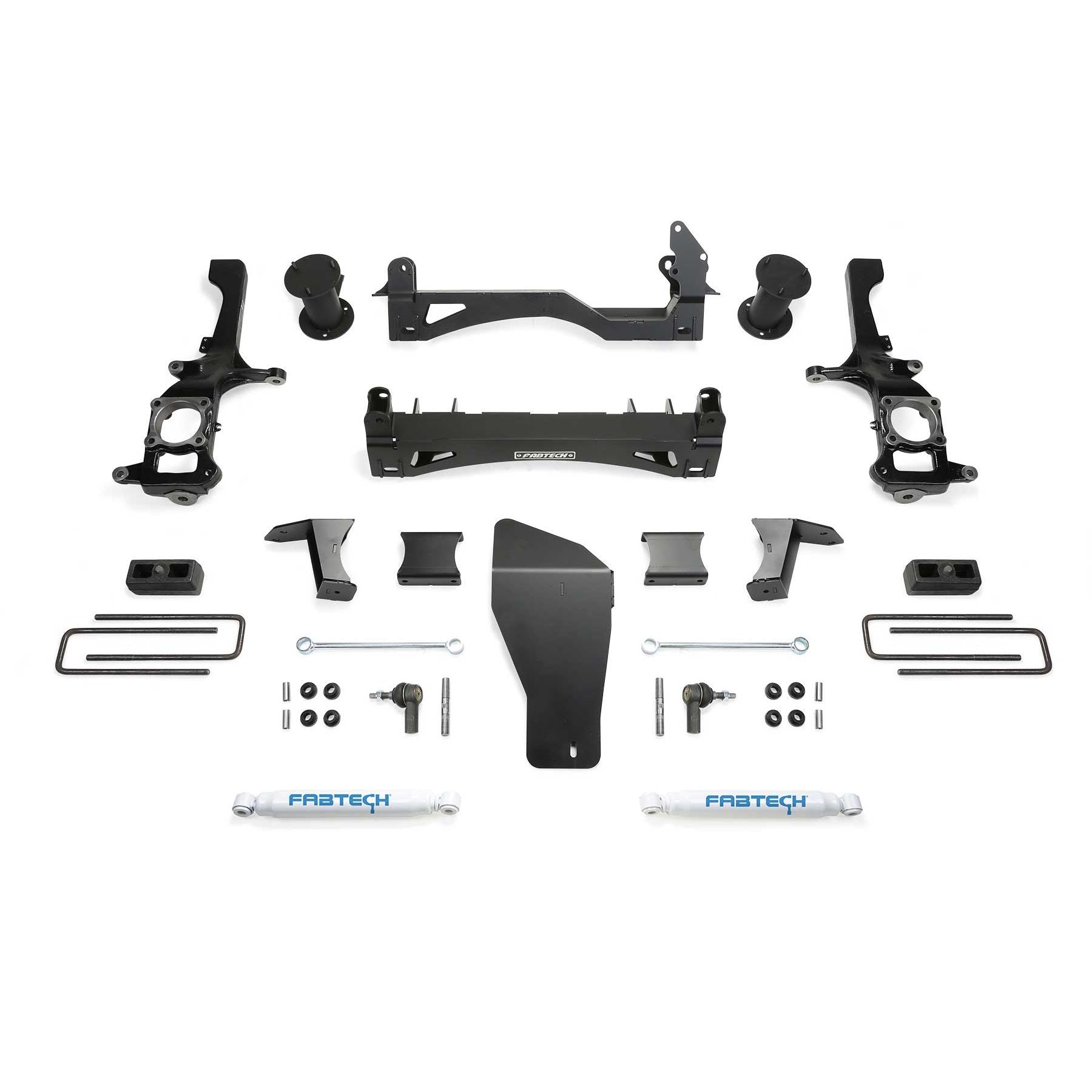The Basic System includes front coilover spacers that utilize the factory Coilover shocks. Includes rear Performance shocks. The Nissan XD systems feature Fabtech's proven IFS technology with extended length ductile iron steering knuckles for proper factory electronic stability control functionality. Heavy duty 1/4in thick steel lower control arm crossmembers provide superior ground clearance while the integrated front differential skid plate adds protection to the drivetrain. Rear lift is accomplished with a block and u-bolt configuration.