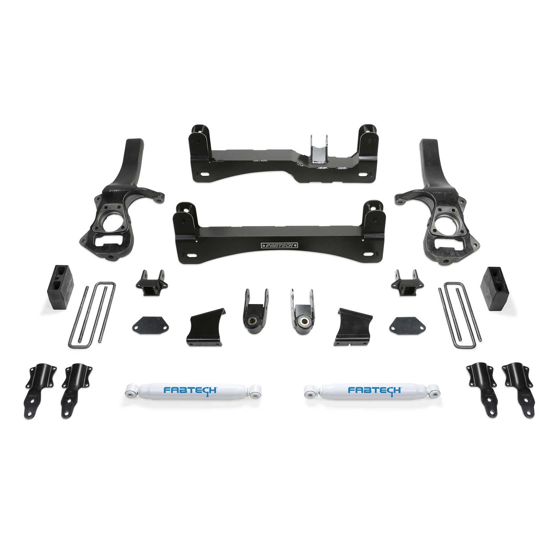 Fabtech's Basic lift kit features our world renowned IFS suspension design for the Chevy/GMC 1500 2WD providing excellent drive ability both on and offroad. There is zero bump steer throughout the suspension cycle that helps reduce drive fatigue while improving the overall drive ability of the vehicle. The near stock track width keeps the tires under the fenders for a clean appearance. Fabtech's proprietary steering knuckle geometry provides excellent lock to lock turning radius to maneuver in tight spots. Heavy duty 1/4" thick steel crossmembers feature OE style alignment cam pins that utilize the factory cams for easy adjustment. The factory coilover shocks are relocated from the bottom to allow for full steer while achieving 6in of lift. Rear lift is accomplished with a 5" Block and u-bolt system. Fabtech has addressed all aspects of the suspension for proper Wheel travel and lock to lock steering without over cycling. Comes with a free 5 year 60,000 mile Powertrain Warranty. FEATURES: 1/4" thick steel lower control arm Crossmembers are arched for maximum ground clearance. The welded box design of these Crossmembers provides additional strength to the front suspension. Retains factory alignment cams for easy adjustment. Fabtech's extended length ductile iron Steering Knuckles provide zero bump steer throughout the suspension travel. This provides an enhanced driver experience compared to stock. Near stock track width keeps the tires under the fenders for a clean appearance. Oversized tie rods are provided to replace the stock units that are designed to handle oversized tires. The factory Coilovers are relocated with heavy duty lower mounts to lift the vehicle while retaining the stock ride quality. 1/4" thick steel drop brackets reposition the front sway bar for the increased ride height. This allows the sway bar link ends to fully cycle without binding throughout the extended travel range. Billet spacers relocate the factory closed cell bump stops to