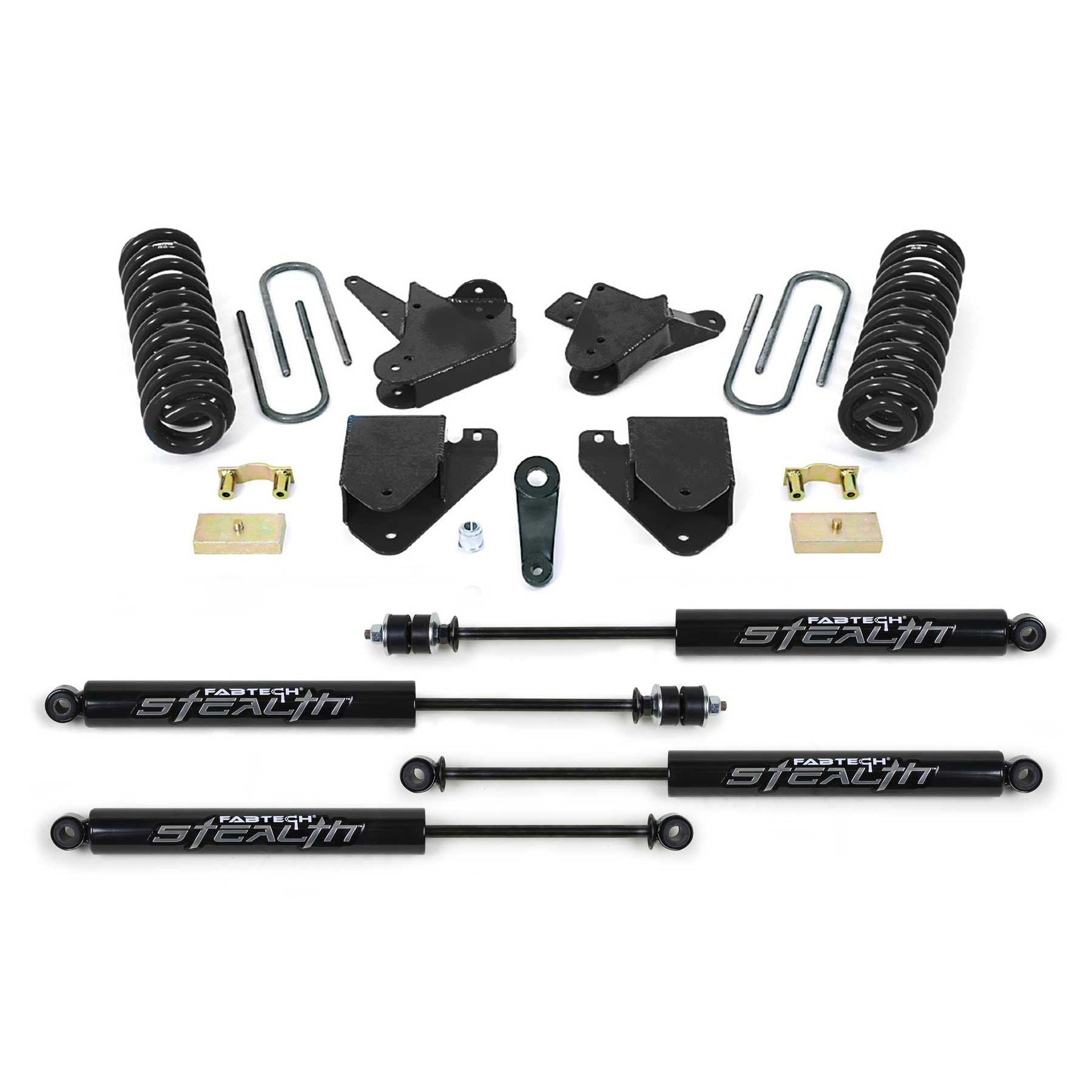Utilizing the vehicle's stock I beams and radius arms the heavy duty 1/4'' thick brackets relocate these components with extended length coil springs for increased ride height and proper front suspension geometry. System includes heavy duty brackets, drop pitman arm, front and rear Stealth shocks and a rear block kit.
