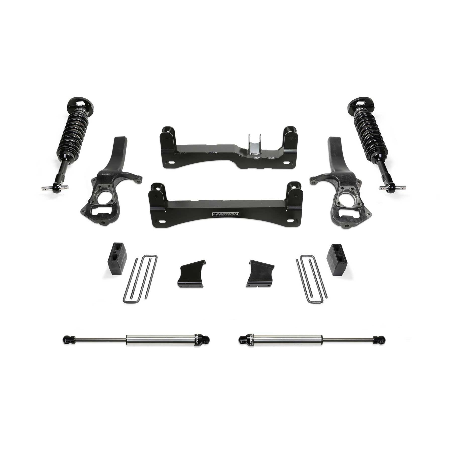 Fabtech's world renowned IFS suspension design for the Chevy/GMC 1500 2WD provides excellent drive ability both on and offroad. There is zero bump steer throughout the suspension cycle that helps reduce drive fatigue while improving the overall drive ability of the vehicle. The near stock track width keeps the tires under the fenders for a clean appearance. Fabtech's proprietary steering knuckle geometry provides excellent lock to lock turning radius to maneuver in tight spots. Heavy duty 1/4in thick steel crossmembers feature OE style alignment cam pins that utilize the factory cams for easy adjustment. The stainless steel Dirt Logic 2.5 Coilovers provide 6in of lift with an outstanding ride quality both on and offroad. They are designed for aggressive offroad use yet have a supple on road feel. Rear Dirt Logic 2.25 shocks aid in damping the vehicle for a balanced ride. Rear lift is accomplished with a 5in Block and U-bolt system. Fabtech has addressed all aspects of the suspension for proper Wheel travel and lock to lock steering without over cycling. Comes with a free 5 year 60,000 mile Powertrain Warranty. CROSSMEMBERS: 1/4in thick steel lower control arm Crossmembers are arched for maximum ground clearance. The welded box design of these Crossmembers provides additional strength to the front suspension. Retains factory alignment cams for easy adjustment. STEERING KNUCKLES: Fabtech's extended length ductile iron Steering Knuckles provide zero bump steer throughout the suspension travel. This provides an enhanced driver experience compared to stock. Near stock track width keeps the tires under the fenders for a clean appearance. TIE RODS: Oversized tie rods are provided to replace the stock units that are designed to handle oversized tires. DIRT LOGIC 2.5 COILOVERS: Constructed of a stainless steel body with NitroSteel piston rod for maximum corrosion resistance and durability. Superior ride quality both on and offroad. Excellent damping for offroad use. SWAY BAR