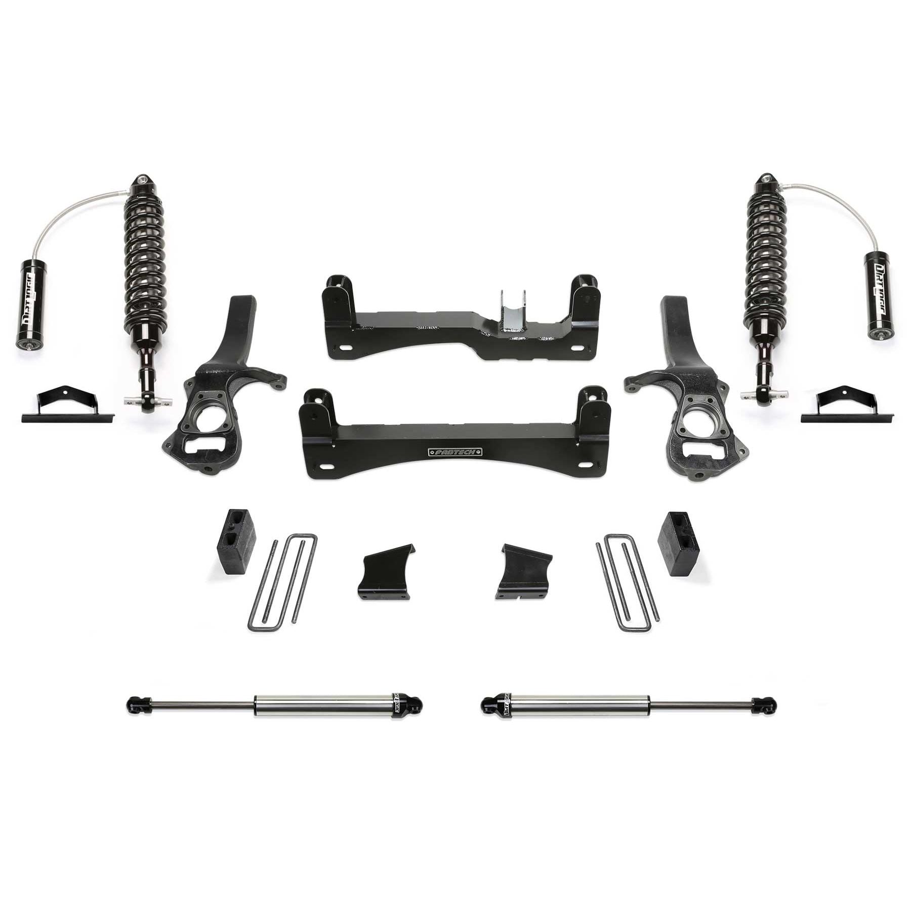 Fabtech's world renowned IFS suspension design for the Chevy/GMC 1500 2WD provides excellent drive ability both on and offroad. There is zero bump steer throughout the suspension cycle that helps reduce drive fatigue while improving the overall drive ability of the vehicle. The near stock track width keeps the tires under the fenders for a clean appearance. Fabtech's proprietary steering knuckle geometry provides excellent lock to lock turning radius to maneuver in tight spots. Heavy duty 1/4in thick steel crossmembers feature OE style alignment cam pins that utilize the factory cams for easy adjustment. The stainless steel Dirt Logic 2.5 Coilovers provide 6in of lift with an outstanding ride quality both on and offroad. They are designed for aggressive offroad use yet have a supple on road feel. Rear Dirt Logic 2.25 shocks aid in damping the vehicle for a balanced ride. Rear lift is accomplished with a 5in Block and U-bolt system. Fabtech has addressed all aspects of the suspension for proper Wheel travel and lock to lock steering without over cycling. Comes with a free 5 year 60,000 mile Powertrain Warranty. CROSSMEMBERS: 1/4in thick steel lower control arm Crossmembers are arched for maximum ground clearance. The welded box design of these Crossmembers provides additional strength to the front suspension. Retains factory alignment cams for easy adjustment. STEERING KNUCKLES: Fabtech's extended length ductile iron Steering Knuckles provide zero bump steer throughout the suspension travel. This provides an enhanced driver experience compared to stock. Near stock track width keeps the tires under the fenders for a clean appearance. TIE RODS: Oversized tie rods are provided to replace the stock units that are designed to handle oversized tires. DIRT LOGIC 2.5 COILOVERS: Constructed of a stainless steel body with NitroSteel piston rod for maximum corrosion resistance and durability. Superior ride quality both on and offroad. Excellent damping for offroad use. SWAY BAR