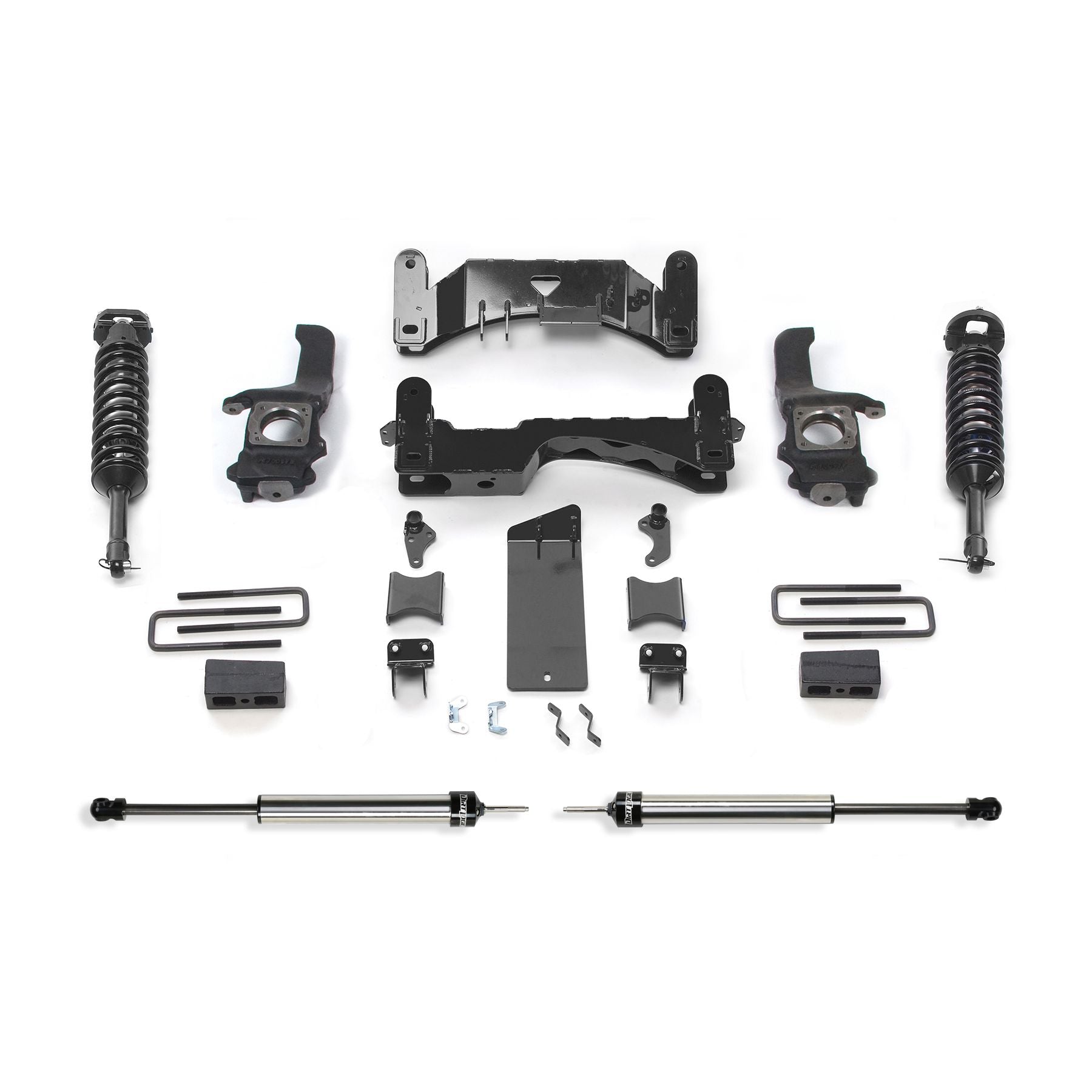 Our Tundra systems feature extended length ductile iron steering knuckles that have been designed to operate within the factory steering geometry. This geometry provides proper turning radius with oversized tires and Wheels. The factory lower control arms are relocated with high arched 1/4in thick steel crossmembers with an integrated differential skid plate for protection against offroad obstacles. The factory front sway bar is retained and utilizes sway bar drops. The Performance system includes our Dirt Logic 2.5 Coilover shocks for aggressive offroad use with a good highway ride and utilizes a 3in block and u-bolt system for rear lift.