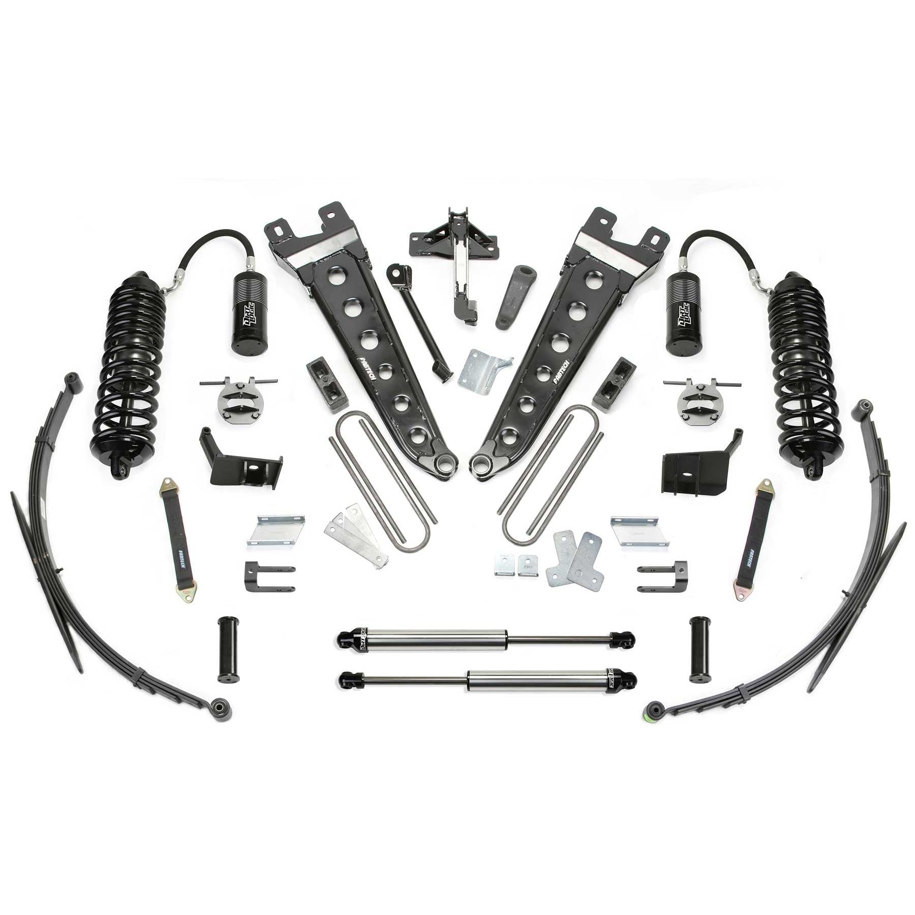 Fabtech's Radius Arm system for the Ford Super Duty is built to handle the on and offroad demands of the truck enthusiast. This system is a complete upgrade to the factory suspension and will provide additional strength for use with oversized tires. The heart of this quality system is Fabtech's tubular Radius Arms. The design of these arms comes from Fabtech race components built with a tubular structure reinforced by a dimple die side plate and heavy gusseting for rugged offroad use. They are a superior upgrade to the stock stamped arms. Included in this system is the massive Dirt Logic 4.0 Coilover Conversion for outstanding damping capacity offroad with a quality on road ride. The Coilover bolts in place of the factory coil spring without removal of the coil spring bucket. The giant 4" diameter aluminum remote reservoir mounts horizontally above the Coilover to allow for full compression travel with oversized tires. The Dirt Logic 4.0 Coilover is the biggest and baddest on the market for the Ford Super Duty. High quality components with properly designed suspension geometry is what sets this system apart from all other Radius Arm suspensions. System includes a free 5 year 60,000 mile powertrain warranty. Each Fabtech component has been designed with specific features and benefits that create this quality suspension system.