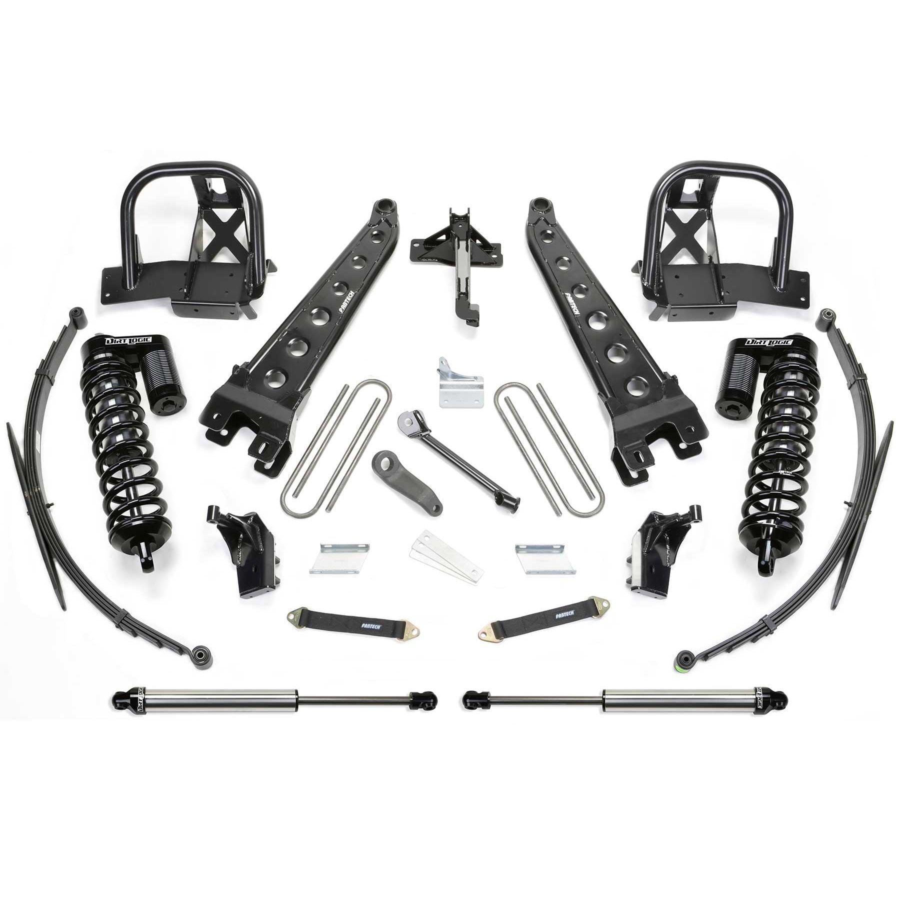 Obtain maximum front suspension damping for Super Duty's with our Dirt Logic 4.0 Stainless Steel Coilover Conversion system. The upper coilover mounts are constructed with 1.75 diameter DOM tubing that replaces the factory coil spring mounts and span across a wide section of the frame for proper impact load distribution. The lower mounts are 1/4'' thick steel that attach to the axle housing, providing solid mounting points for the Dirt Logic 4.0 Stainless Steel Coilover piggyback reservoir shocks. Also included in this system are billet sway bar end links with heim ends and quad layer limiting straps. Includes rear 2.25 Dirt Logic Stainless Steel shocks.