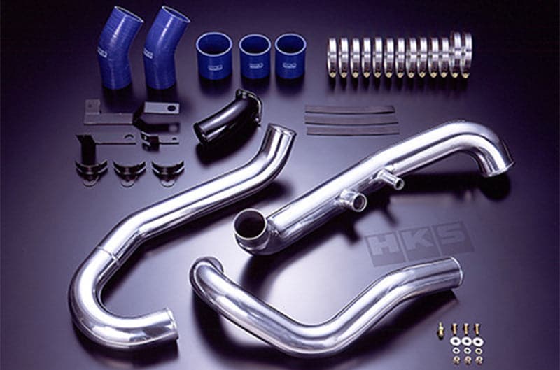 Stock plastic or rubber intercooler pipes can expand or crack under high boost levels. In addition to this, stock pipes have many bends which in some places are very tight radius which causes much resistance and pressure drop. HKS Piping kits are made of aluminum for increased durability and safety. The pipes have been redesigned to decrease the number of bends and to increase bend radius to minimize pressure loss and flow resistance. The piping kit replaces the pipes from the turbocharger to the intercooler and the intercooler to the inlet manifold. A convenient kit that allows the replacement of boost pipes can frequently pop off in higher boost use and is recommended for tuning where the stock intercooler is still used.