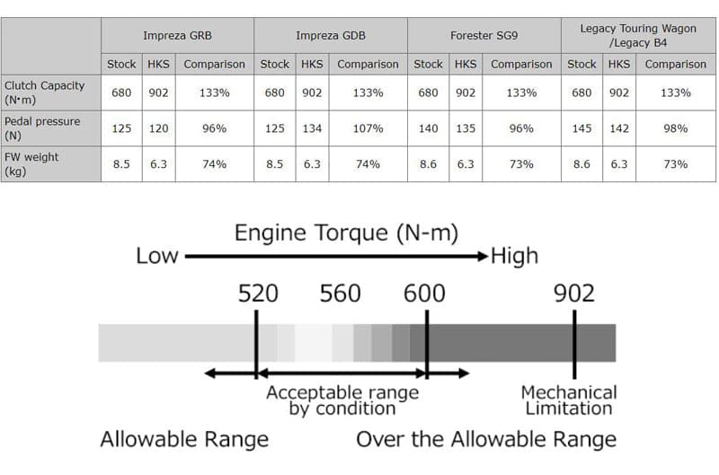 The HKS Single Plate Clutch Kit that includes Clutch Disc, Cover, Flywheel for up to 450HP. "MG Composite Disc" delete uncomfortable vibration during clutch engagement. Launch controllability and higher torque transfer capacity than metal disc are well balanced. Disc Damper prevents unusual noise from the transmission and absorbs shock torque. It protects the drive train. Acceptable Range is the range of engine torque that the clutch can be used for except intentional overheating of the clutch. Acceptable range by the condition is the range that the clutch might slide by rough operation, kickback from tire and distortion of parts, etc.