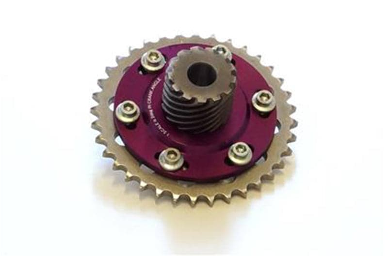 HKS Adjustable Cam Gears allow fine-tuning of the camshaft timing to maximize engine performance and tailor power characteristics for various driving conditions. Either with OEM or HKS Camshafts, adjustments can be made to tune an engine s power band to the optimum RPM range for a particular application. HKS Cam Gears are made completely of anodized Duralumin with nickel plated gear teeth except for applications with timing chains which utilize an aluminum slide with steel teeth. HKS engineers chose Duralumin as the core material for HKS Cam Gears because its lightweight properties decrease drag on the engine. Precise valve timing can be adjusted and set within the range of +/- 20 Deg along a Vernier scale of 2 Deg intervals. Each interval index is laser-etched into the Duralumin and "A" (advance) and "R" (retard) directional markers are also laser-etched onto the cam gear face.