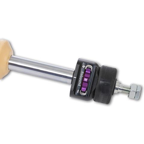 By hand, you can tune the low-speed compression damping with six precise clicks on the purple adjustment dial. The gold adjustment dial allows the user to change the high-speed compression damping with 14 precise clicks. Rebound adjustment is provided with 16 clicks, each providing a noticeable change. A reduction in rebound forces provides a more comfortable ride quality suitable for highway driving.