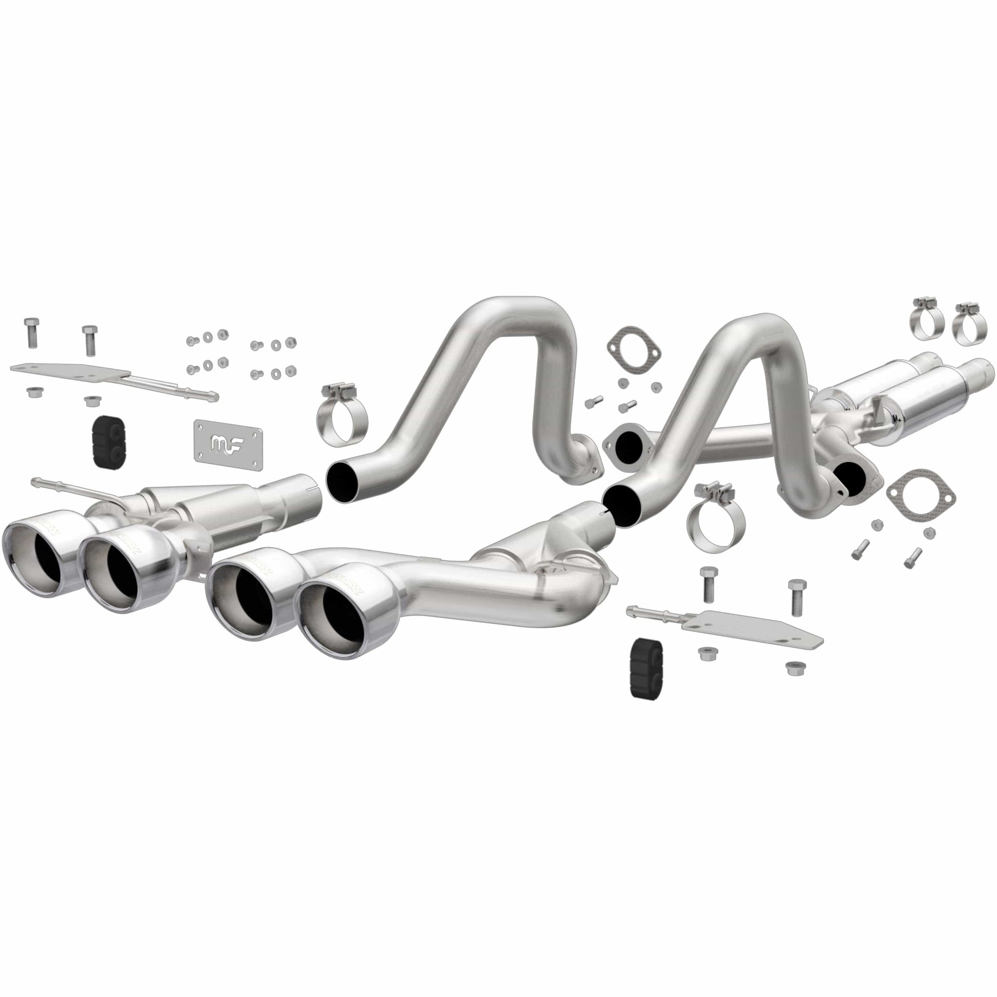 The MagnaFlow 2000-2004 Chevrolet Corvette Competition Series Cat-Back Performance Exhaust System brings an aggressive, attention-grabbing edge to the deep resonant exhaust note we're so well known for. This exhaust kit is designed to enhance your 5.7L 2000-2004 Chevrolet Corvette with dyno-proven performance made possible thanks to fast-flowing mandrel bent 2.5in. main piping and 2 Straight-Through mufflers ending in a Quad Center Rear exit with 4in. Polished Welded-On Double Wall Angle Cut Rolled Edge tips featuring a sporty finish. The exhaust system's cat-back layout replaces your ride's exhaust system from near the catalytic converter on back. Exhaust system 15281 is engineered to make your vehicle's engine produce Aggressive exterior and Moderate interior sound levels, befitting its competition-oriented design. 15281's direct-fit design makes installation a breeze thanks to the use of advanced 3D scanning techniques. This performance exhaust system is made of 100% durable and corrosion-resistant stainless steel and produced using CNC precision robotic manufacturing, all backed by MagnaFlow's limited lifetime warranty. Please check to ensure compliance with local noise regulations.