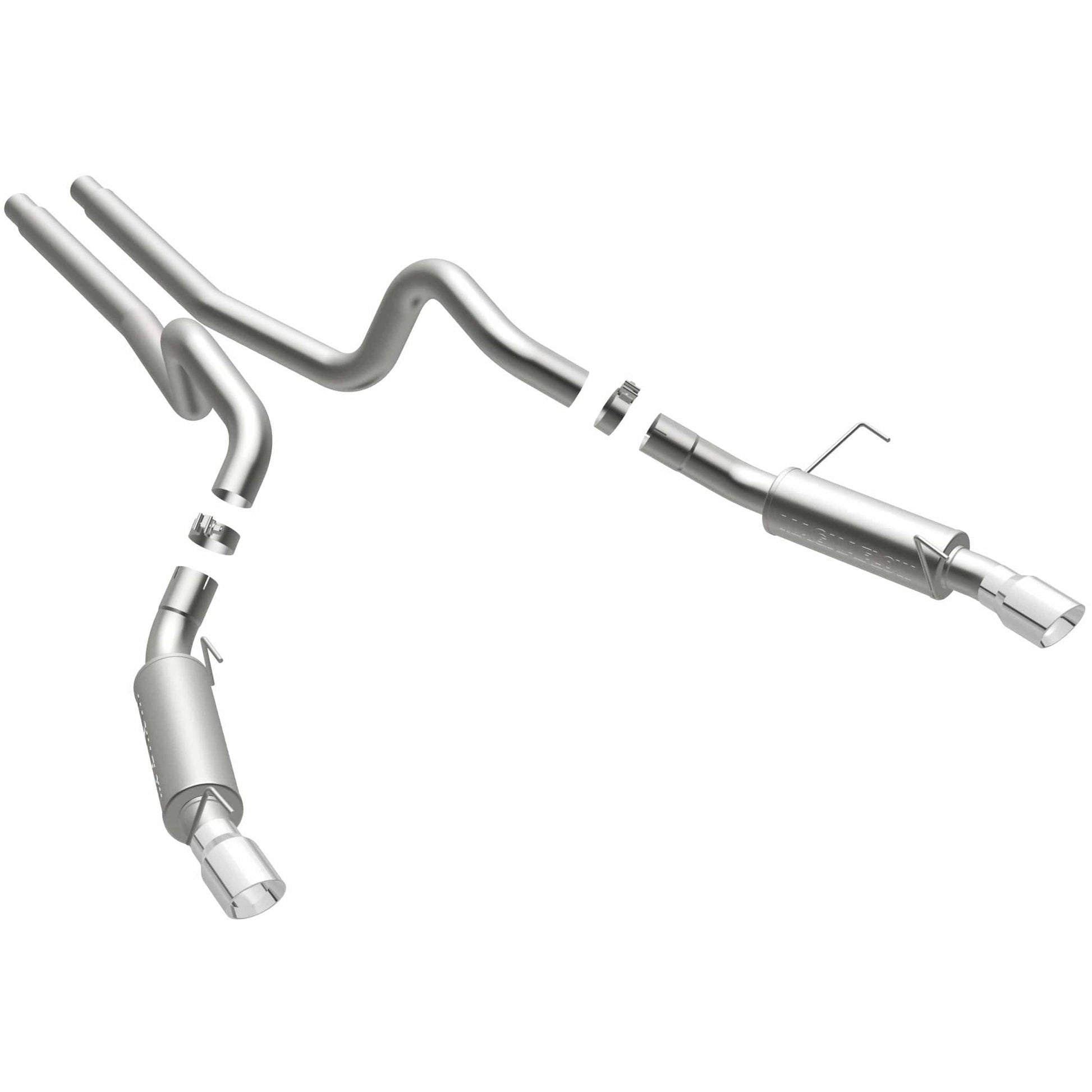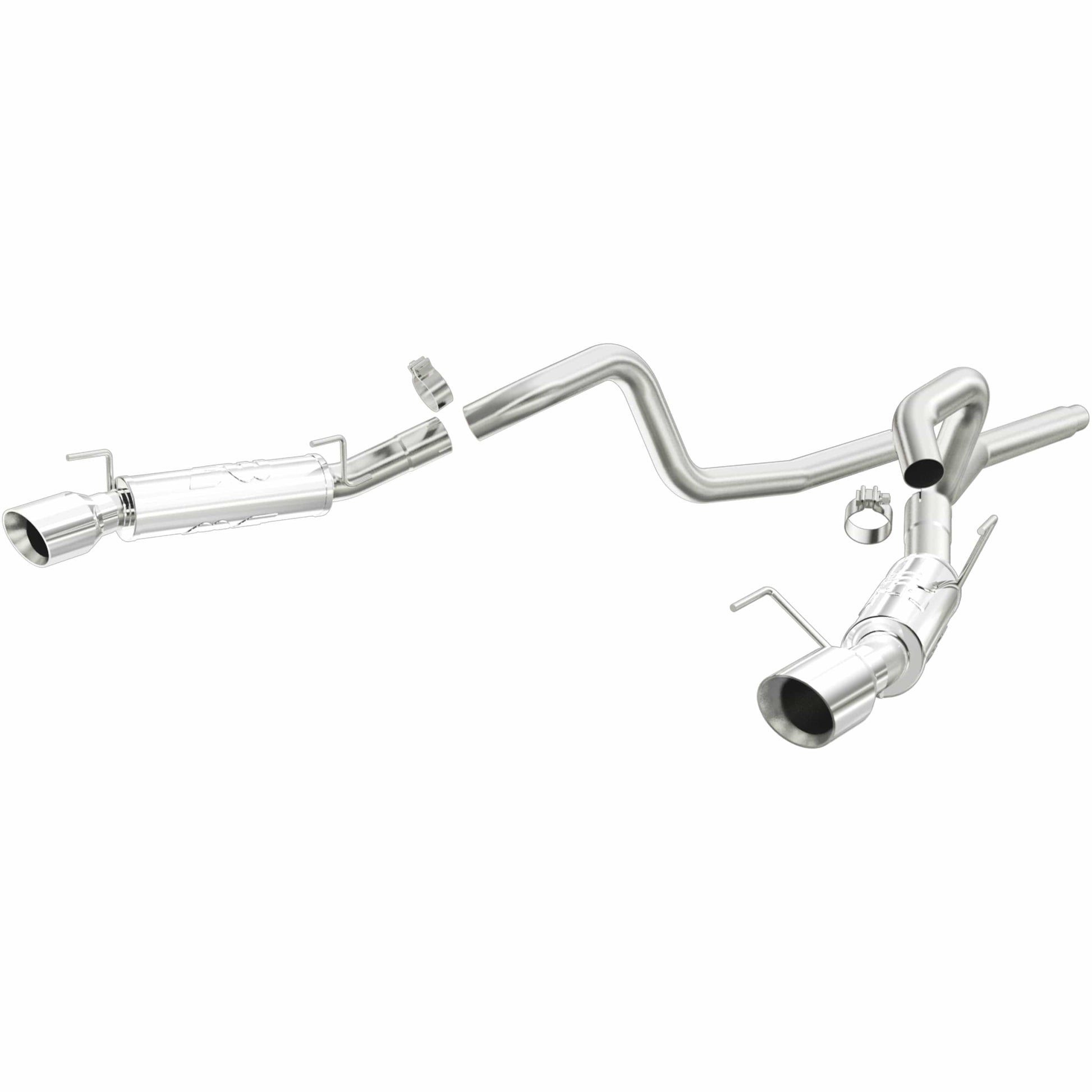 The MagnaFlow 2005-2009 Ford Mustang Competition Series Cat-Back Performance Exhaust System brings an aggressive, attention-grabbing edge to the deep resonant exhaust note we're so well known for. This exhaust kit is designed to enhance your 4.6L, 5.4L 2005-2009 Ford Mustang with dyno-proven performance made possible thanks to fast-flowing mandrel bent 3in. main piping and 2 Straight-Through mufflers ending in a Dual Split Rear exit with 4in. Polished Welded-On Double Wall Angle Cut Folded Edge tips featuring a sporty finish. The exhaust system's cat-back layout replaces your ride's exhaust system from near the catalytic converter on back. Exhaust system 16674 is engineered to make your vehicle's engine produce Aggressive exterior and Moderate interior sound levels, befitting its competition-oriented design. 16674's direct-fit design makes installation a breeze thanks to the use of advanced 3D scanning techniques. This performance exhaust system is made of 100% durable and corrosion-resistant stainless steel and produced using CNC precision robotic manufacturing, all backed by MagnaFlow's limited lifetime warranty. Please check to ensure compliance with local noise regulations.