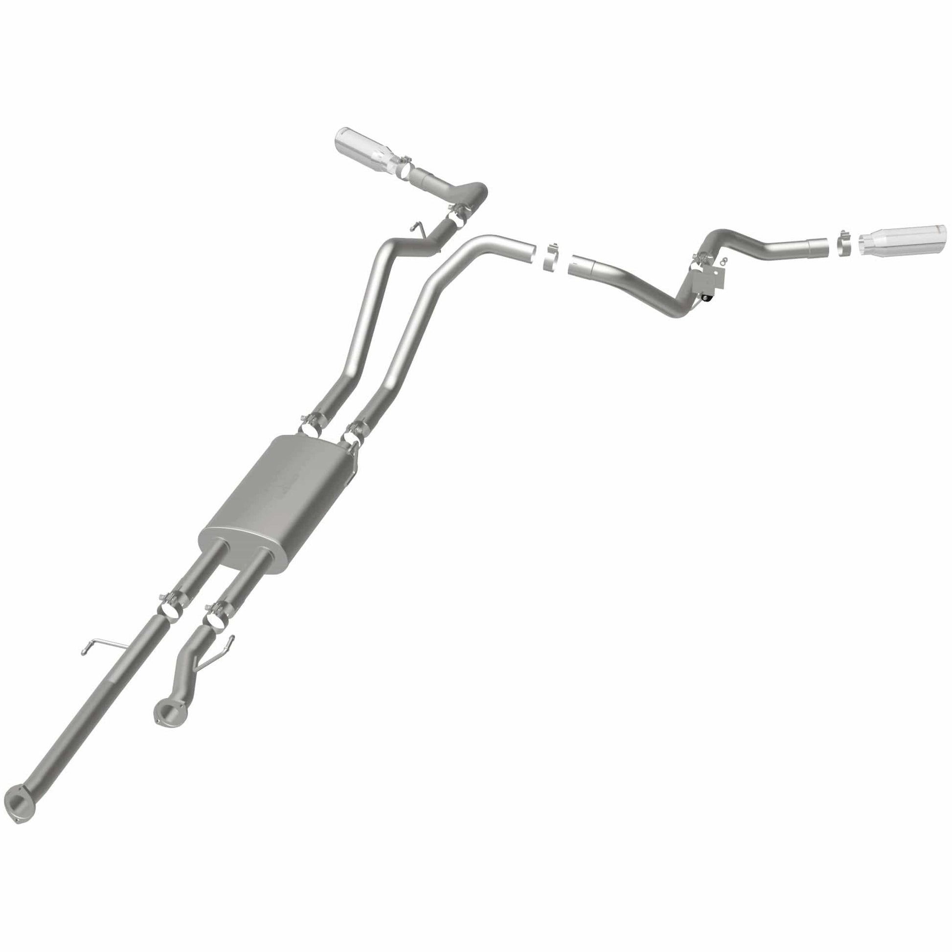 The MagnaFlow 2009-2021 Toyota Tundra Street Series Cat-Back Performance Exhaust System brings out the personality of your 4.6L, 4.7L, 5.7L 2009-2021 Toyota Tundra with our signature resonant, powerful engine tone and dyno-proven performance. Thanks to its fast-flowing, mandrel bent 2.5in. main piping and 1 Straight-Through mufflers ending in a Dual Split Rear Behind Rear Tires exit with 4in. Polished Clamp-On Double Wall Angle Cut Rolled Edge tips, this Toyota Tundra exhaust kit has the performance chops to match its sporty sound and appearance. Upgrade your ride to the next level with an exhaust that has the pipes to put other Toyota Tundra's to shame. With this system your vehicle will be producing Aggressive exterior and Moderate interior sound levels while leaving other cars and trucks feeling envious at every stoplight. Exhaust kit 19232 features a cat-back layout that replaces your ride's stock exhaust components from near the catalytic converter on back. Extensive 3D scanning during development has resulted in a direct-fit design that you can easily install yourself. 19232 is produced using CNC precision robotic manufacturing techniques and is backed by MagnaFlow's 1-year limited finish warranty and limited lifetime construction warranty.